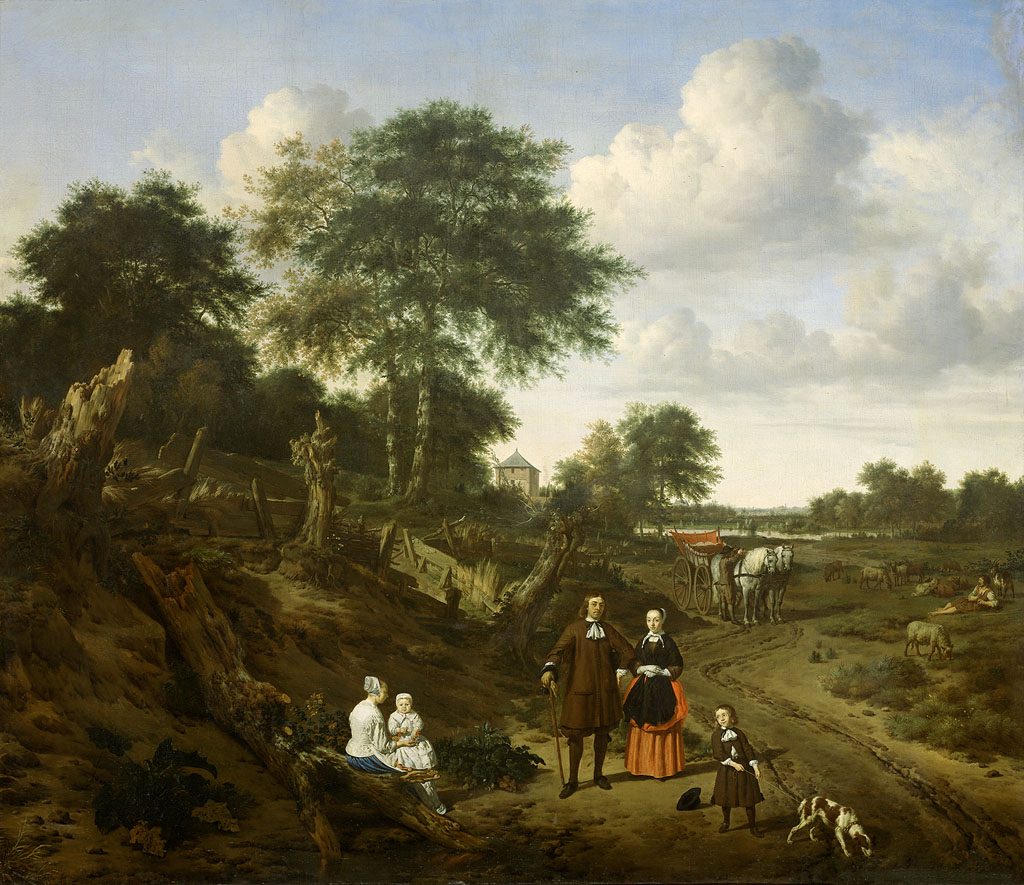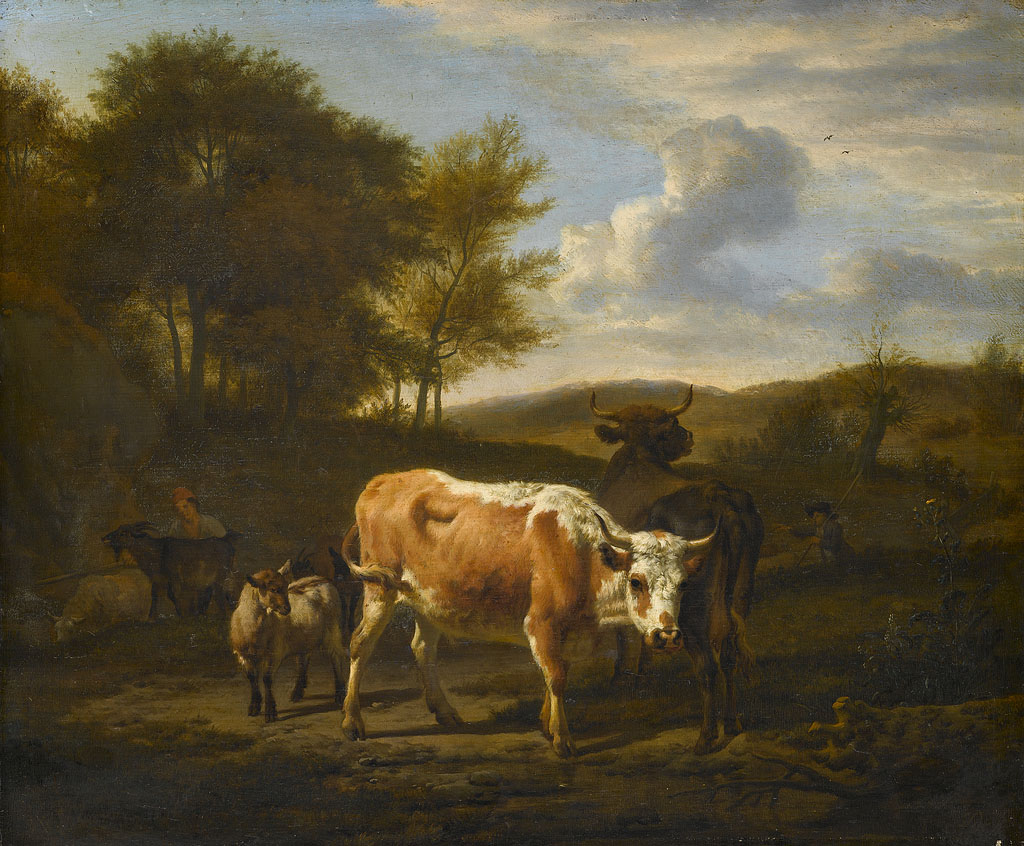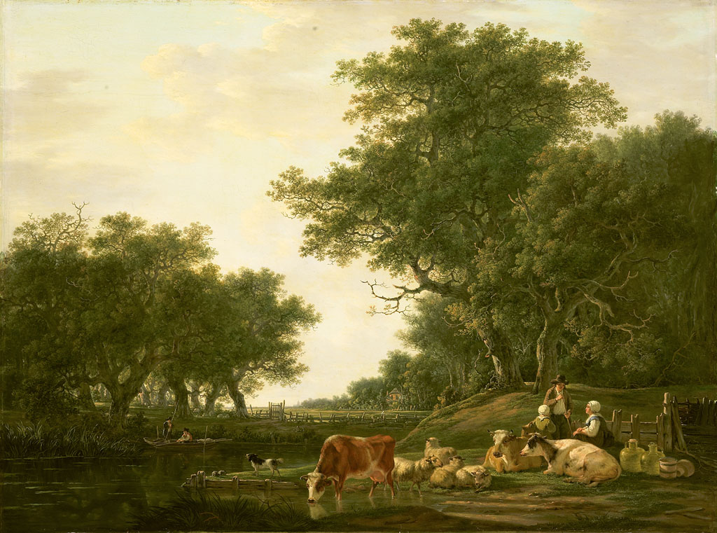 Landschap met landlieden bij hun vee en hengelaars o...