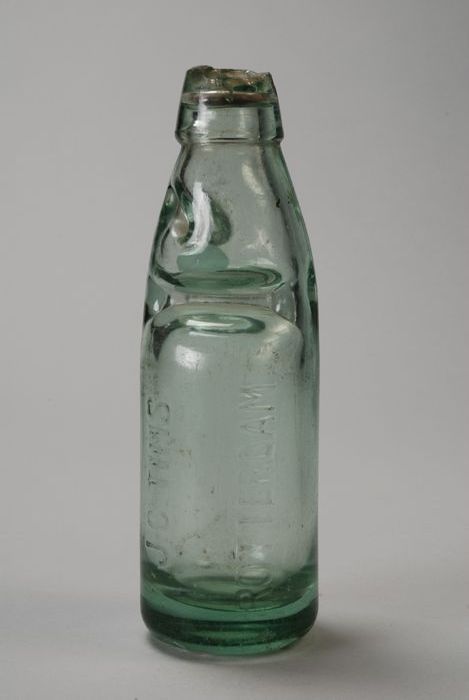 Kogelflesje van blank glas, met opschrift "J.C. TIMS...
