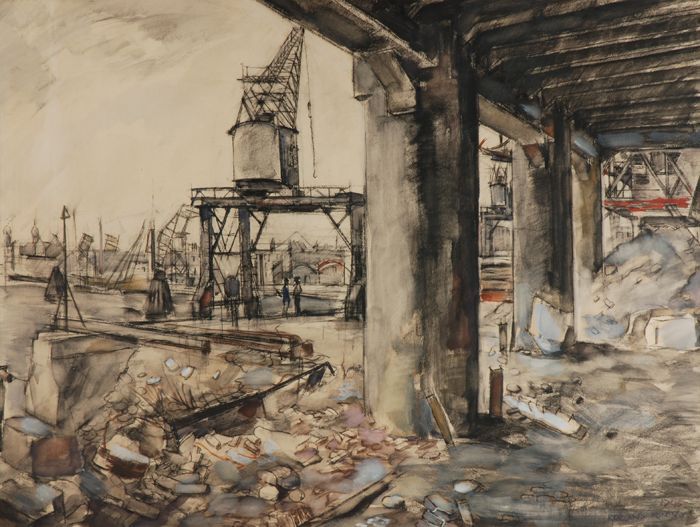 Havengezicht met kraan en puin