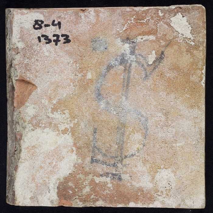 Tegel, man zittend op ton in omlijsting, hoekmotief ...