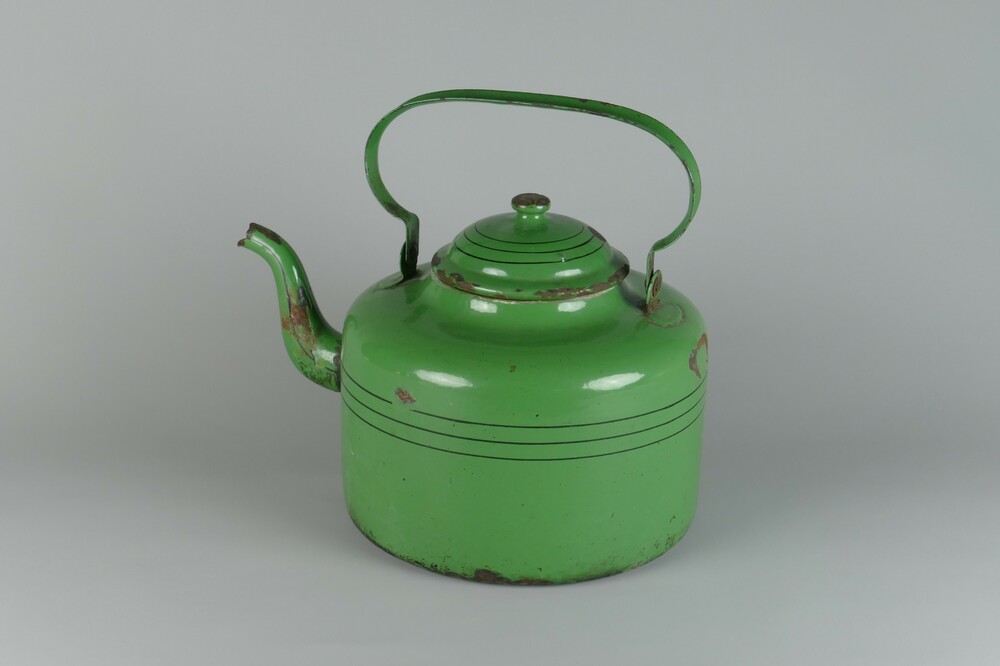 waterketel van groen geëmailleerd ijzer, uit de eers...