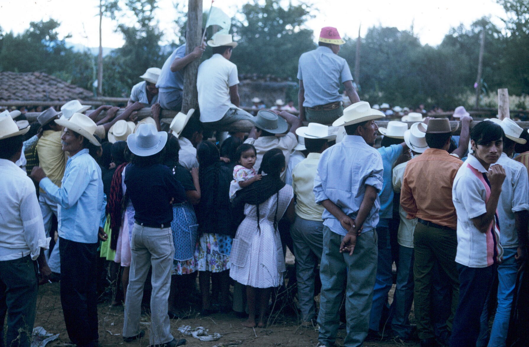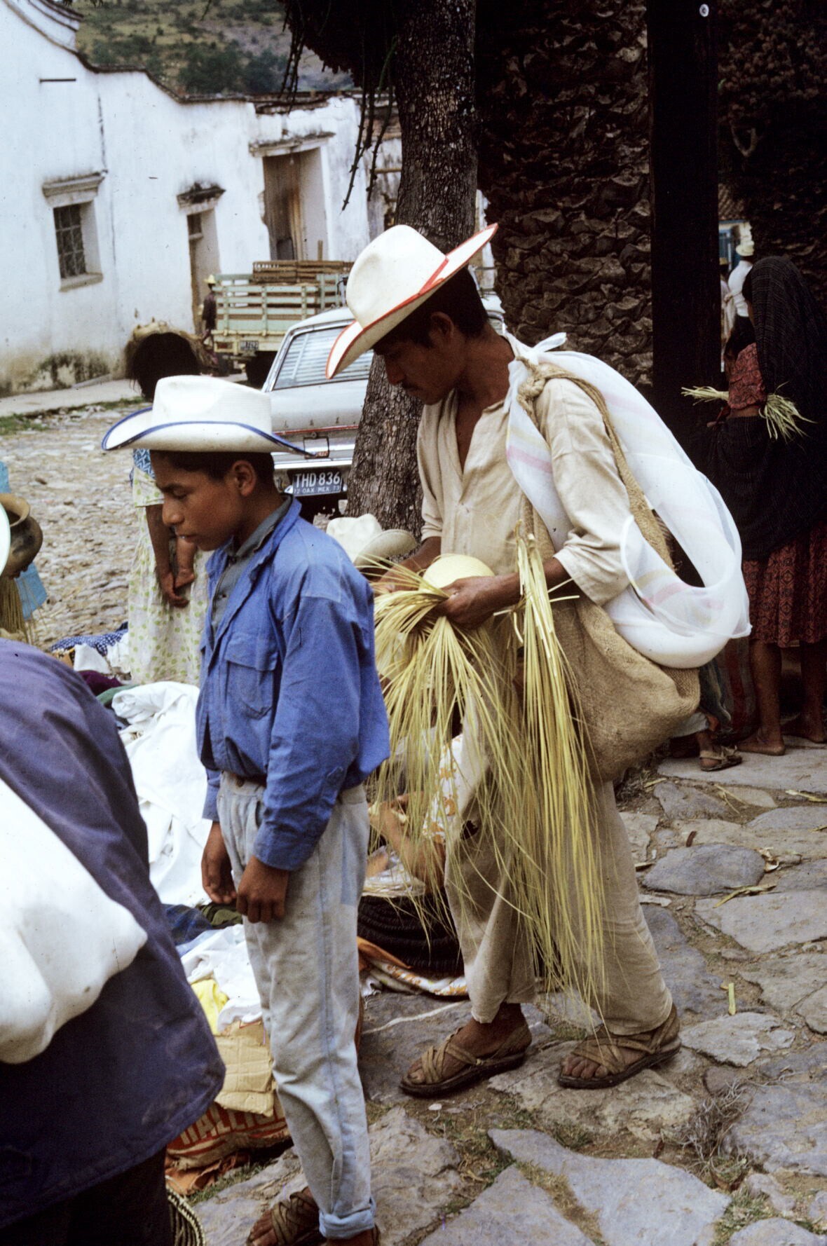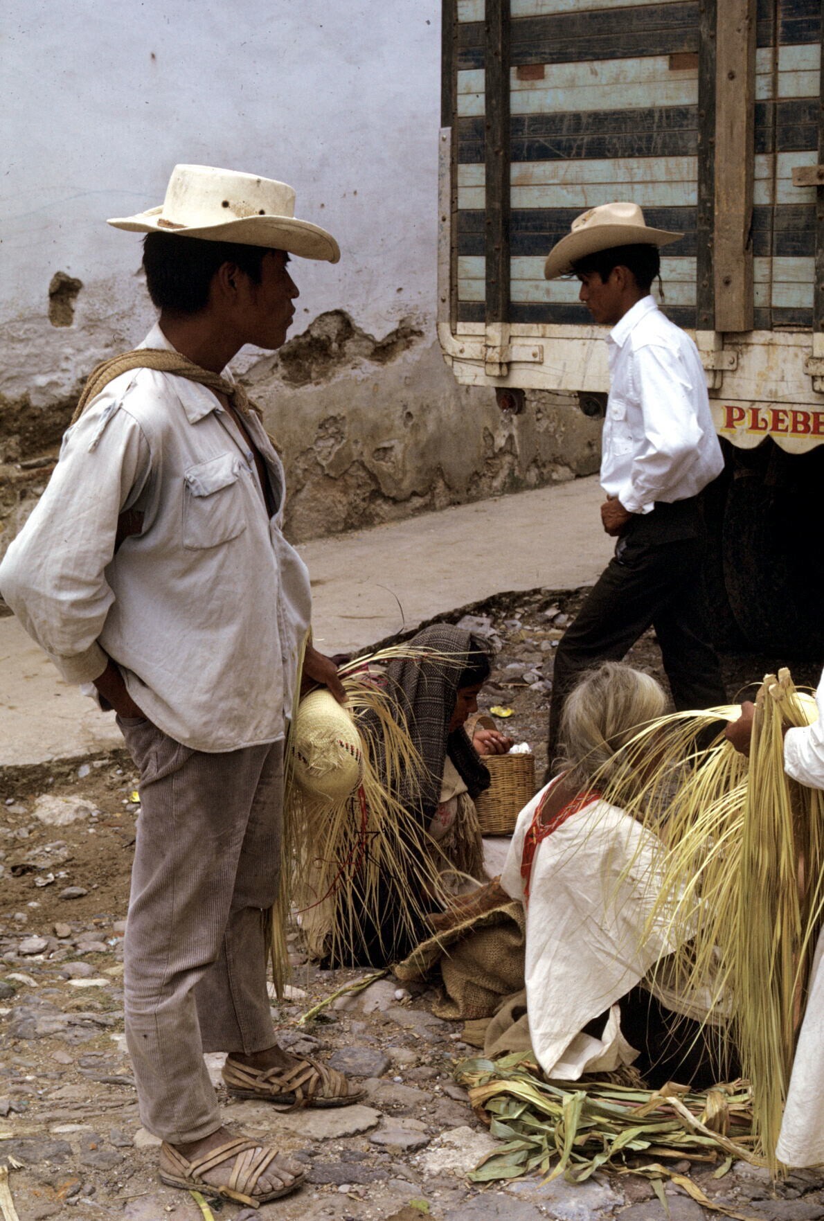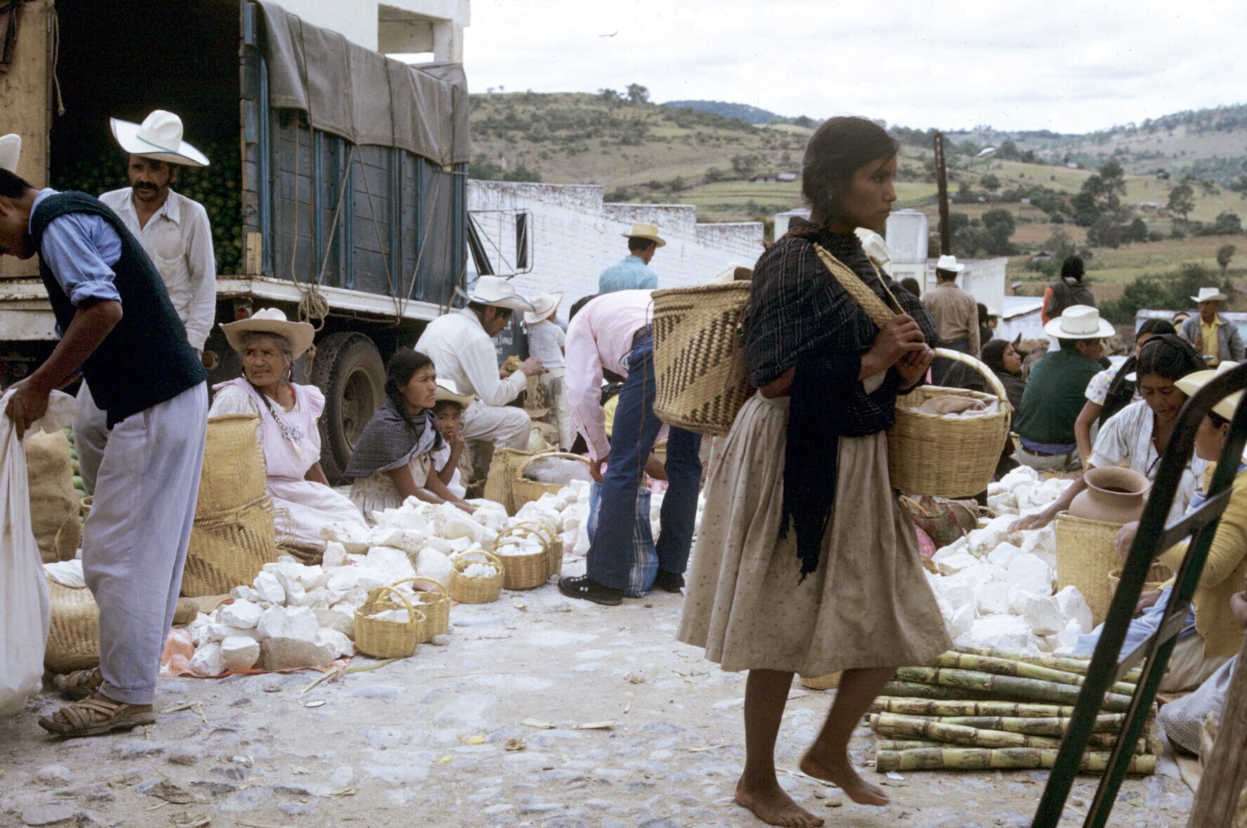 marktscène met kalkblokkenverkoop (voor maïsbereiding)