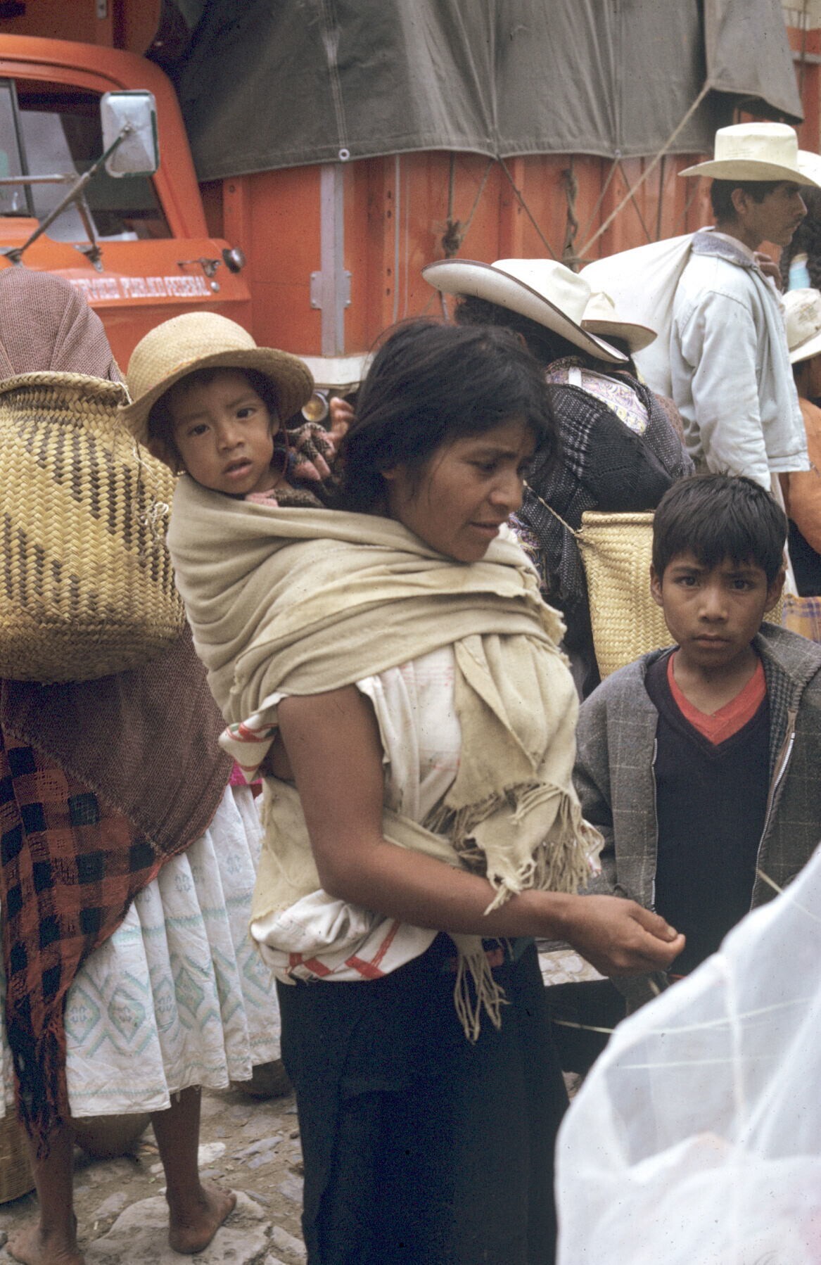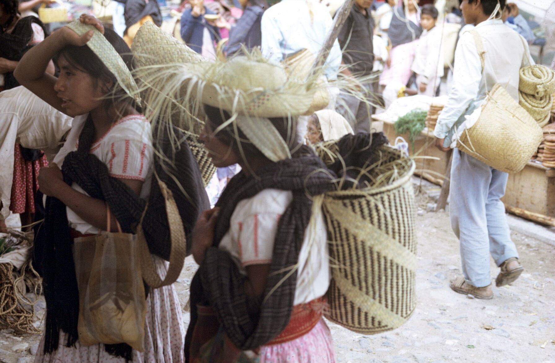 vrouw, mand op rug dragend met mecapal (draagband) o...