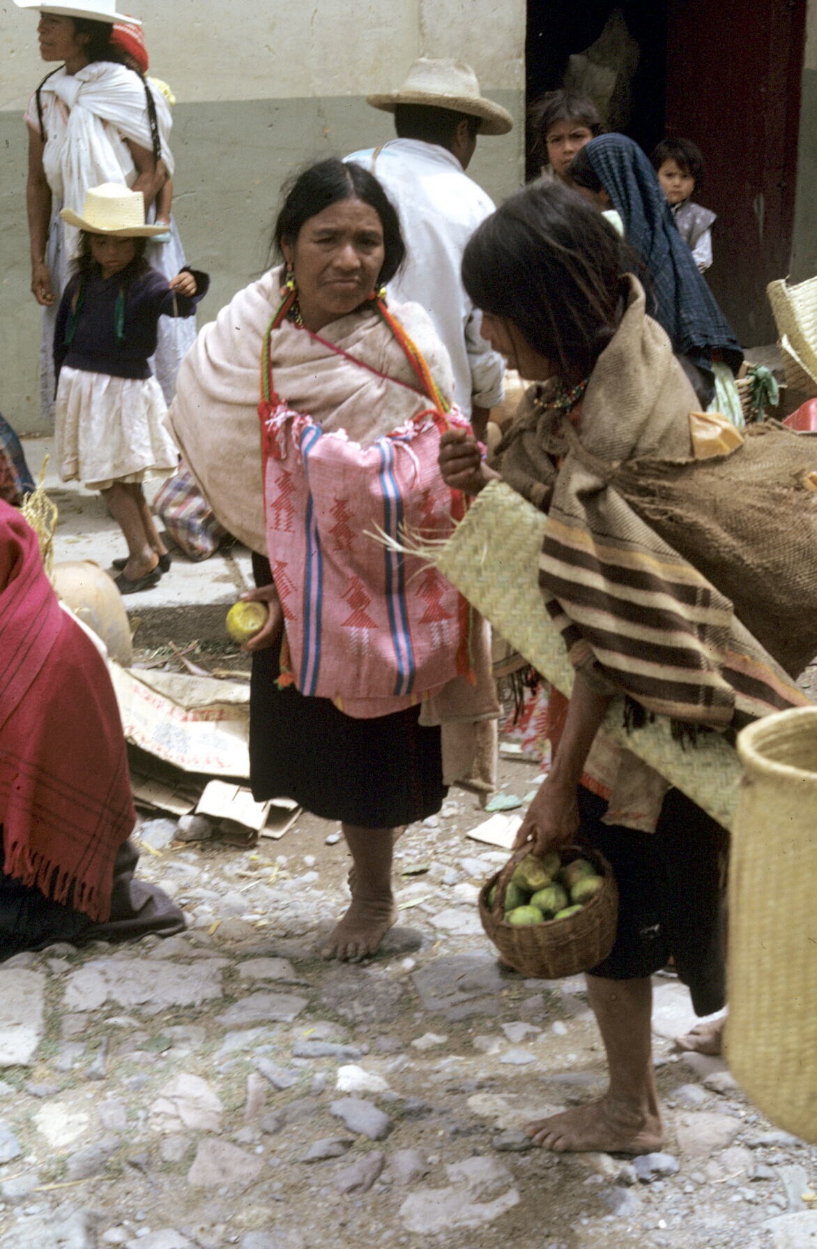marktvrouwen, kalkblokken verkopend (voor maïsbereid...