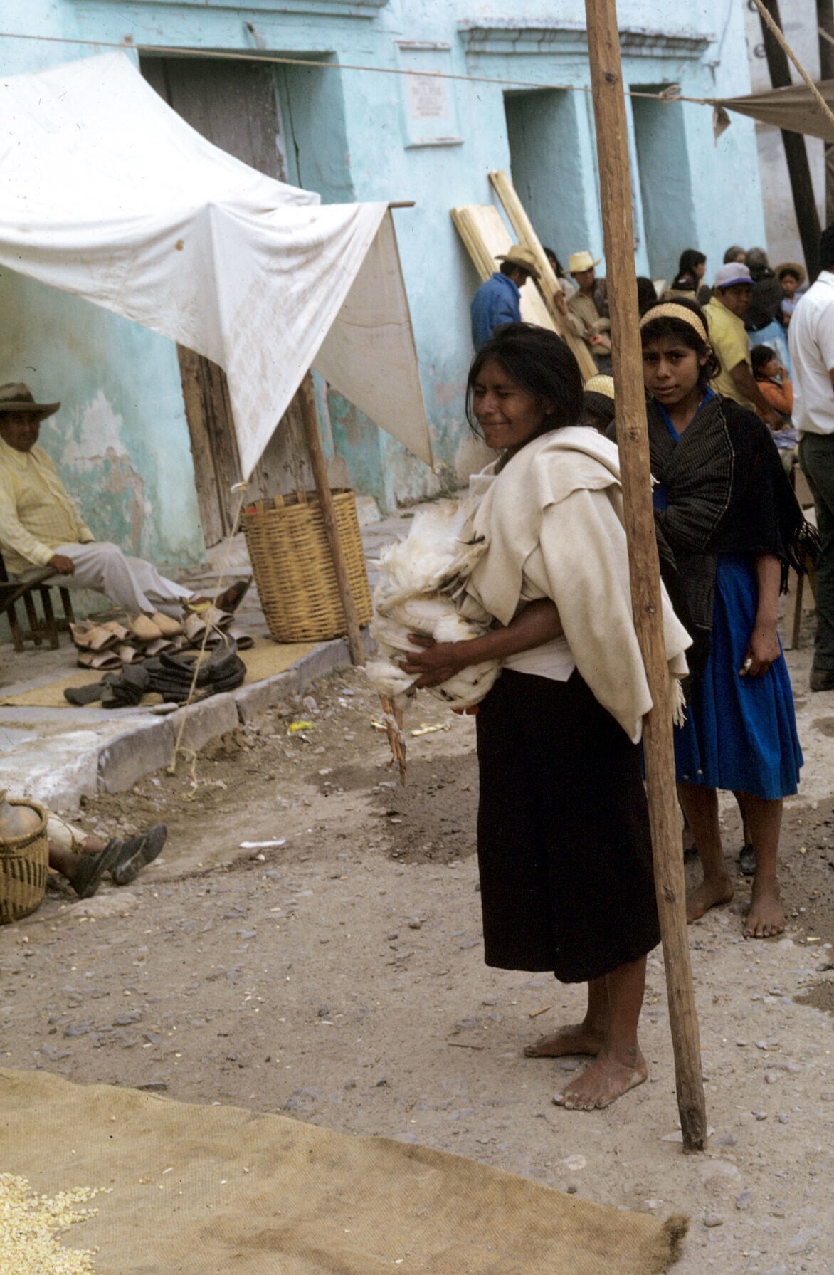 vrouw op markt, haan dragend; op achtergornd: sandal...