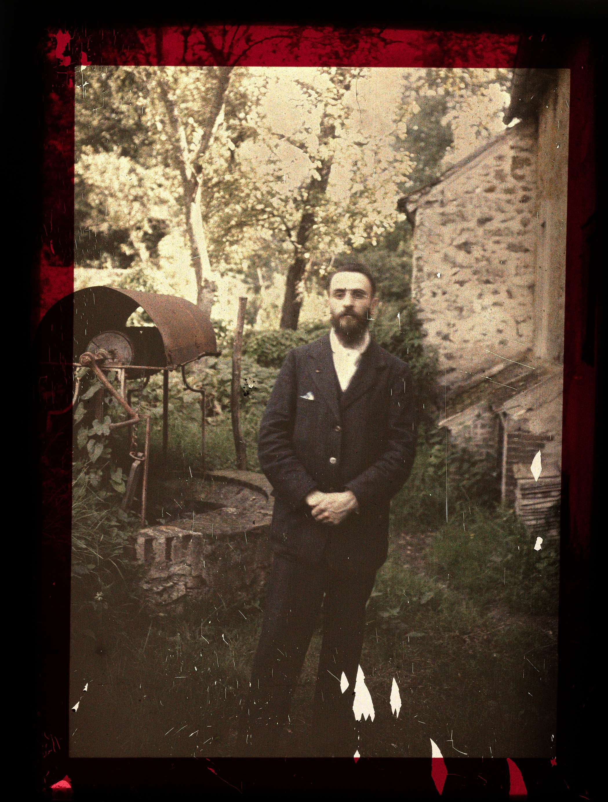 Portret van een onbekende man staand in tuin bij wat...