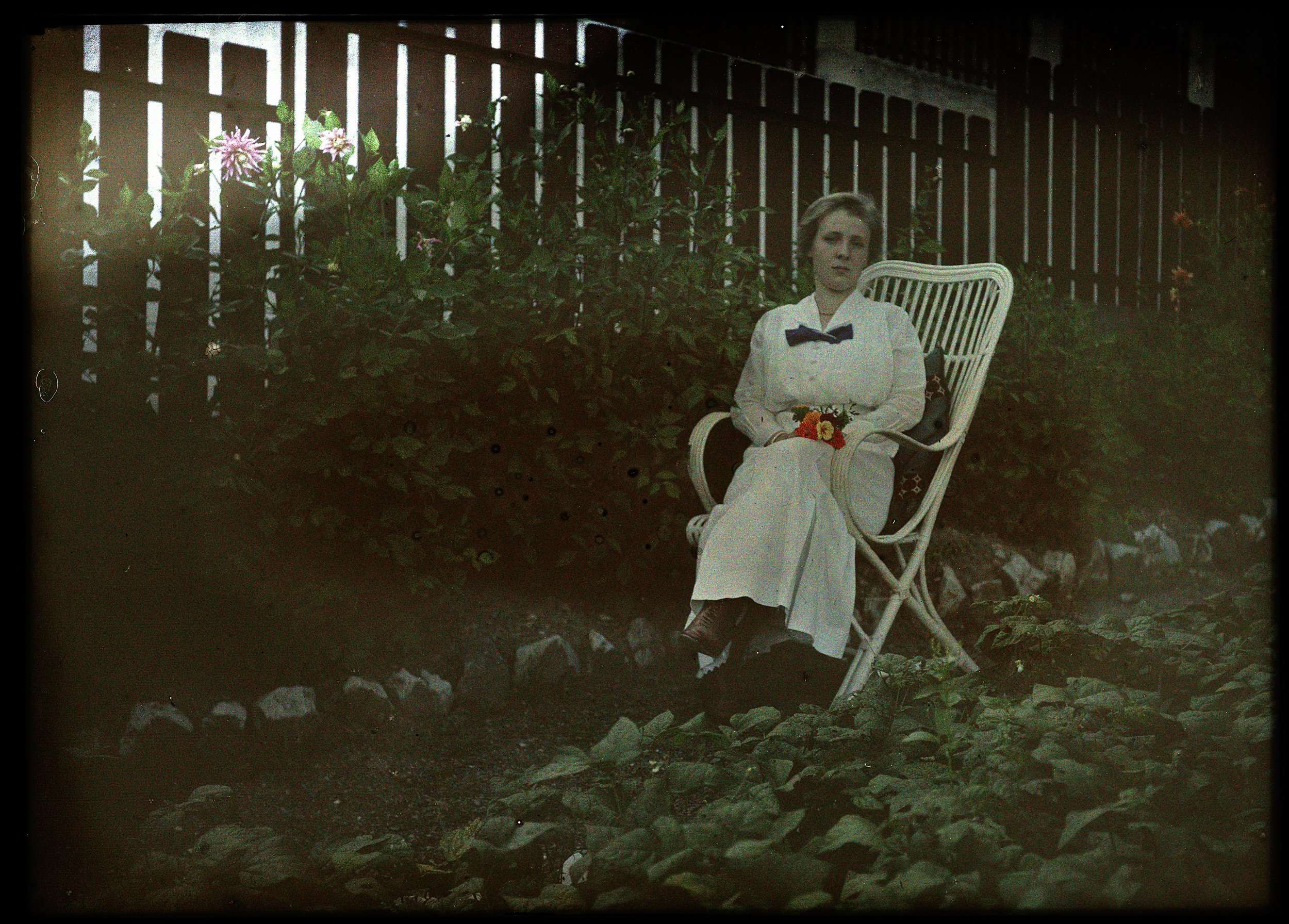 Vrouw zittend in tuin bij Dahlia's