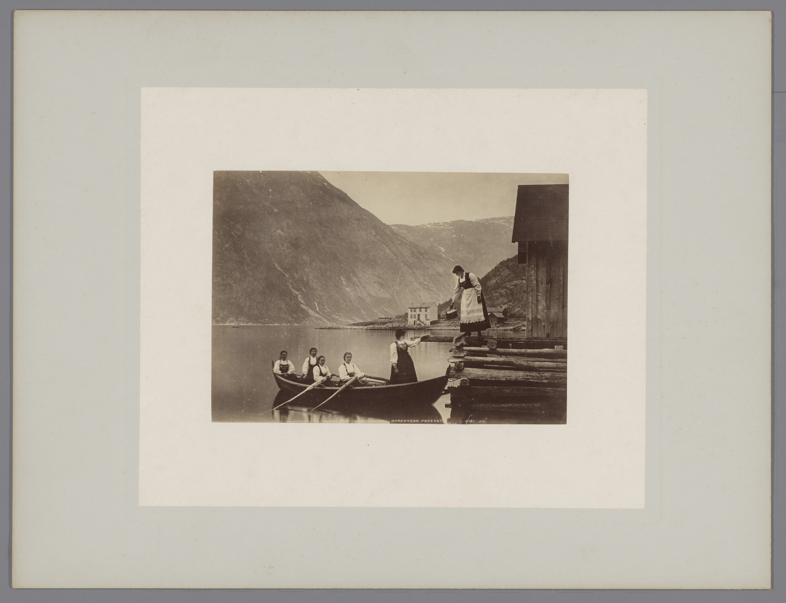 Vrouwen in een roeiboot in de Hardangerfjord, Noorwegen
