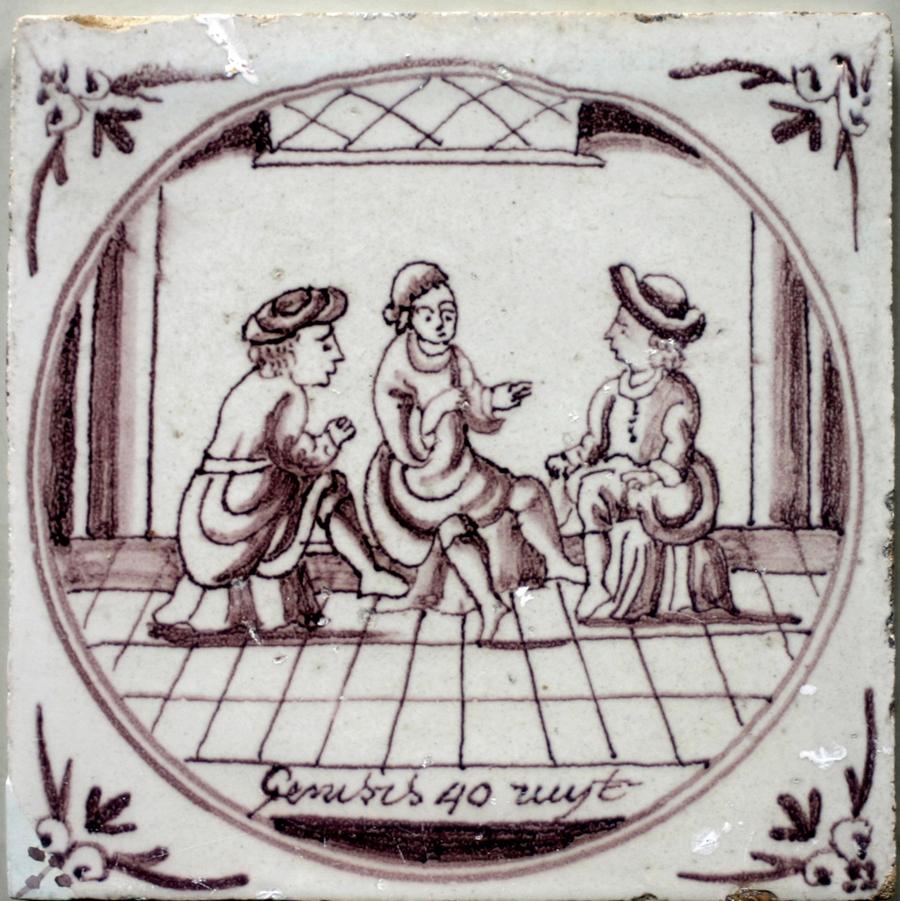 randtegel van aardewerk met tinglazuur, voorstellend...