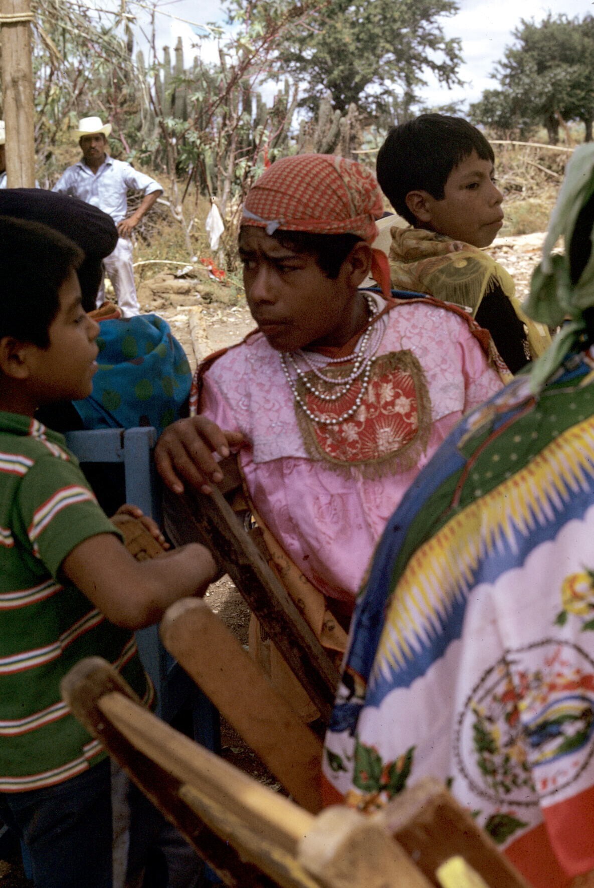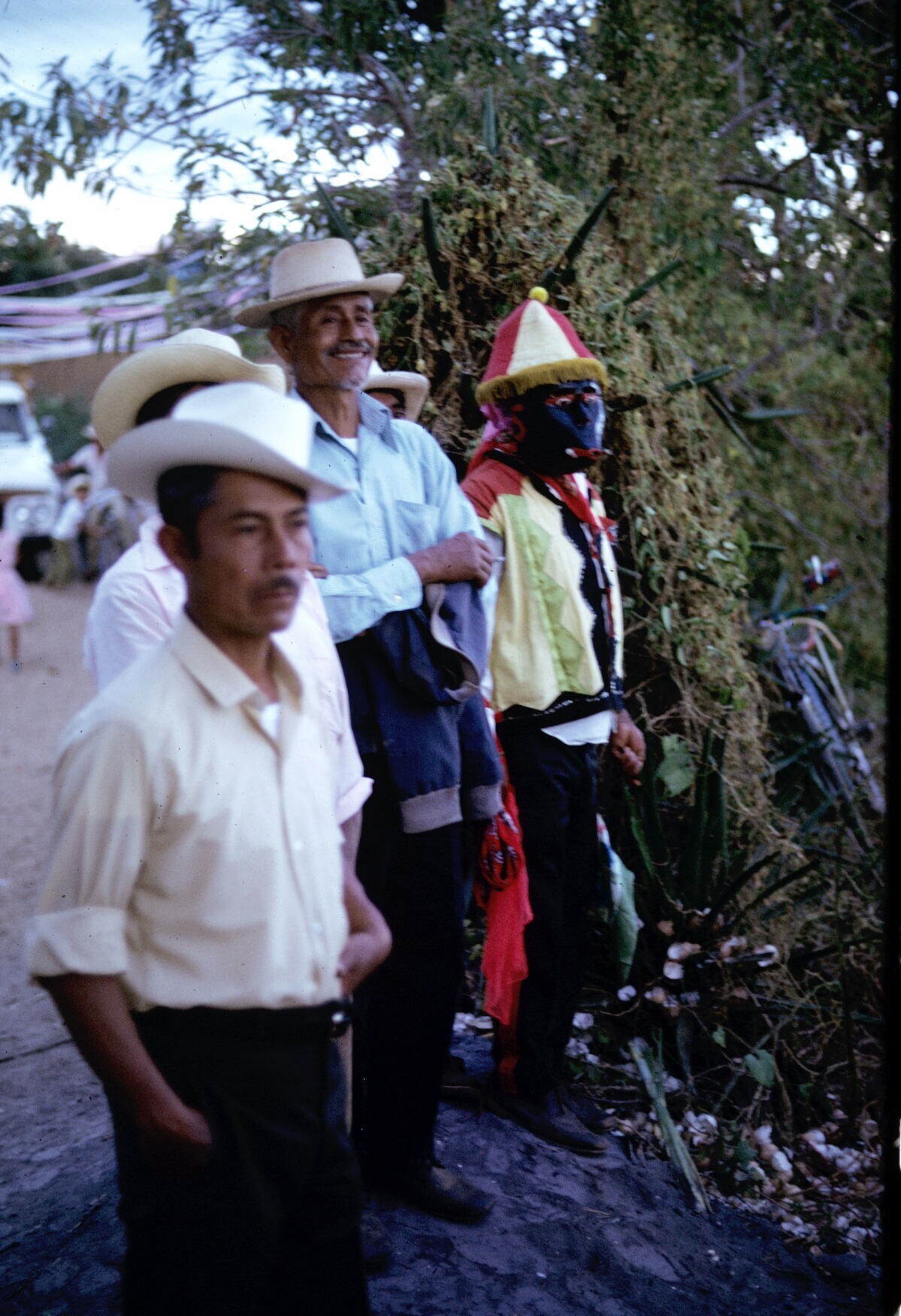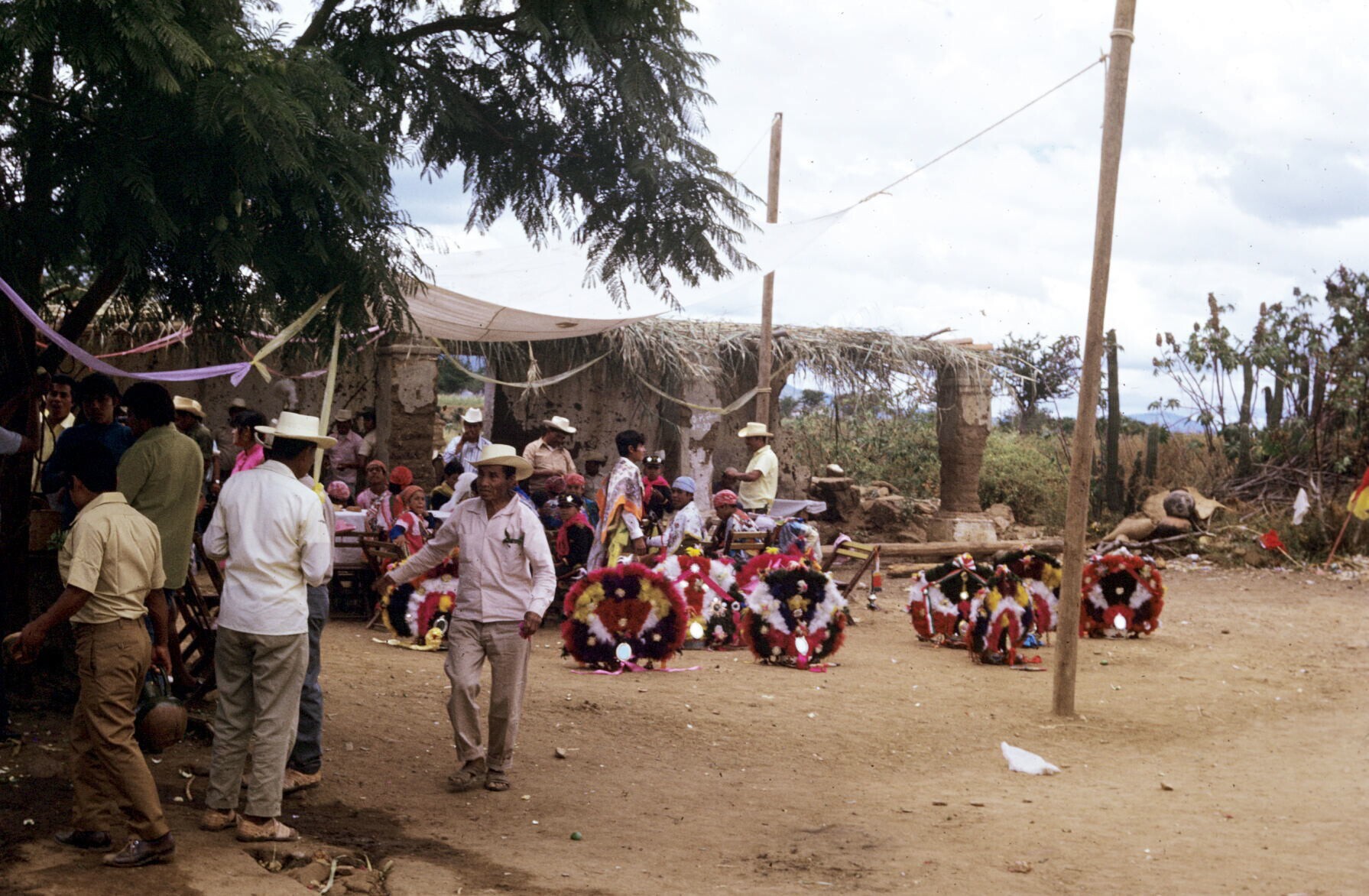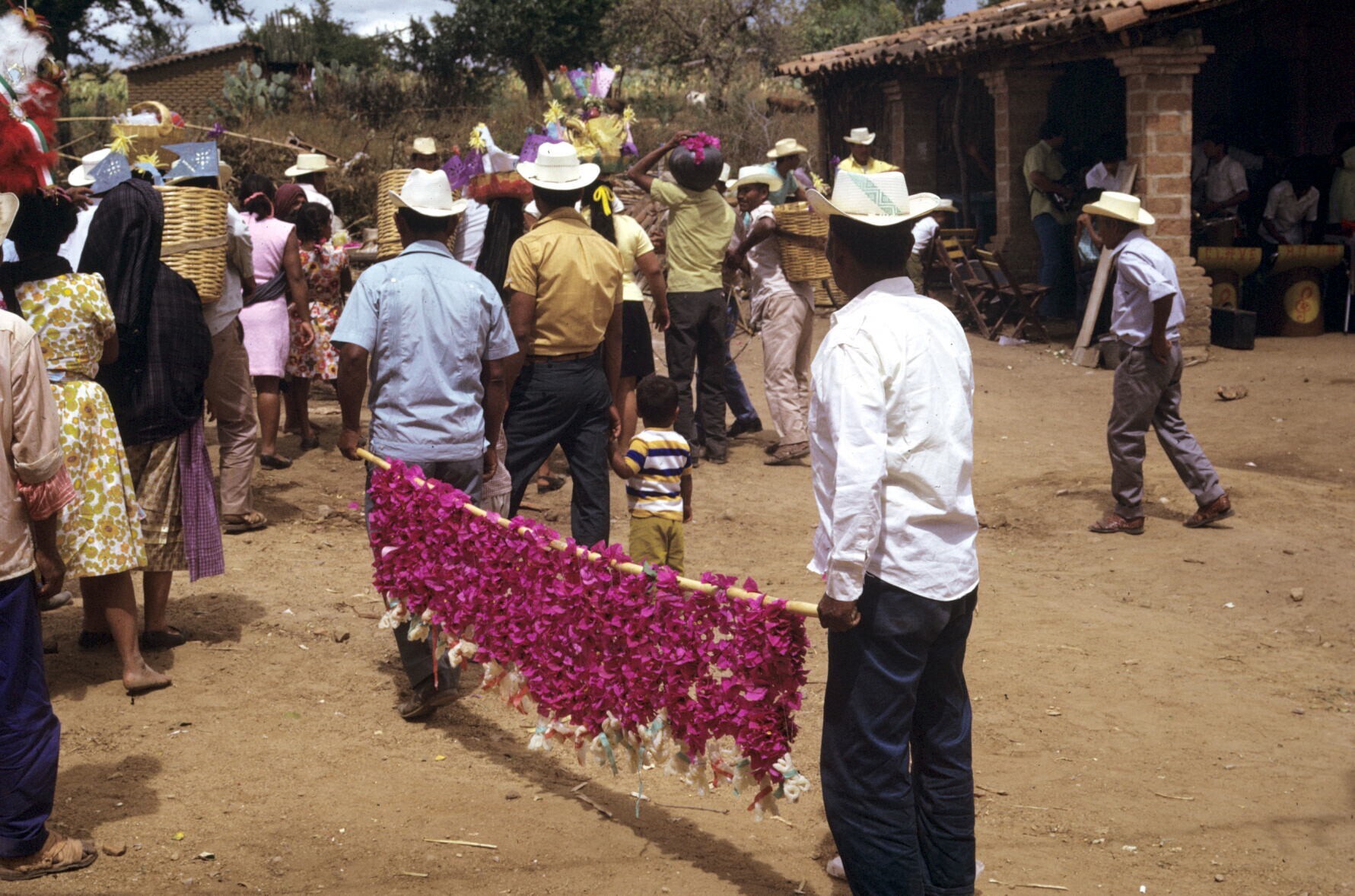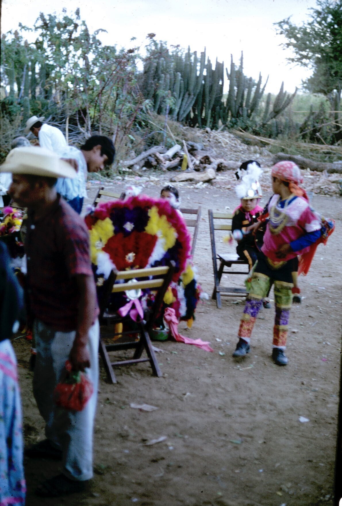 Plumadansers en publiek tijdens feest