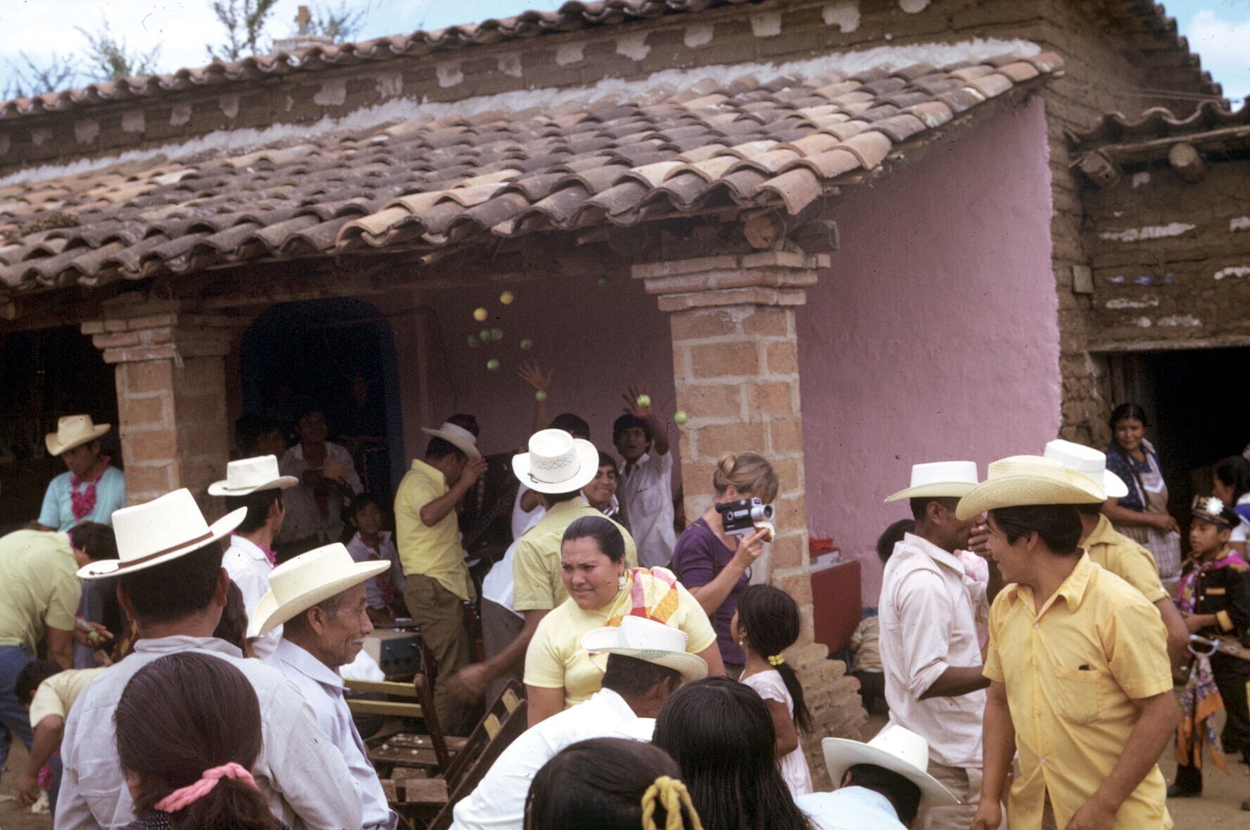 feestgangers (ertussen: Paula Leyenaar met filmcamera)