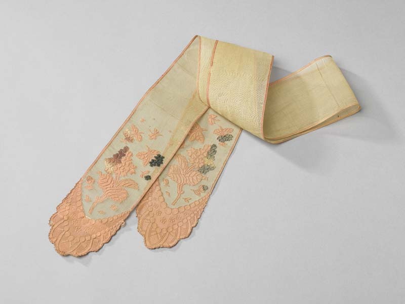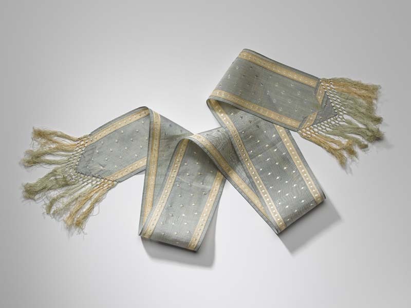 Smalle sjaal van lichtgele batist met aan de uiteind...