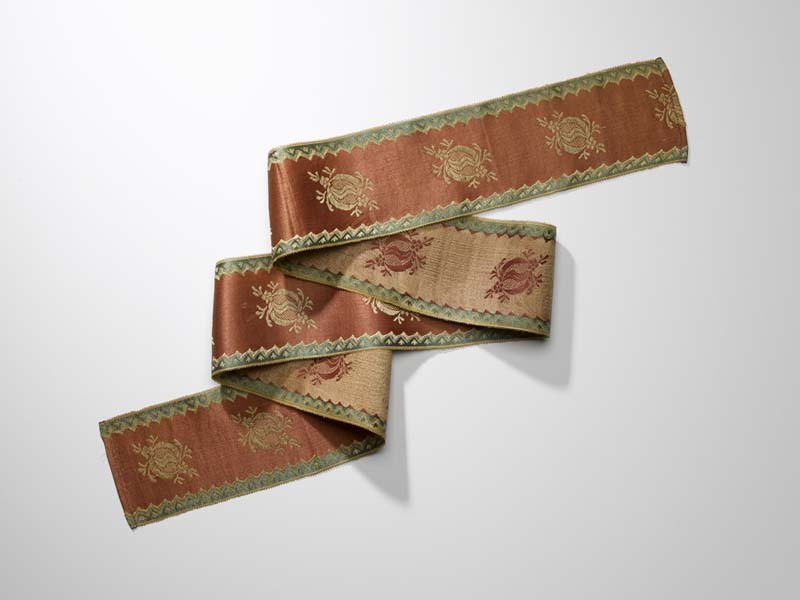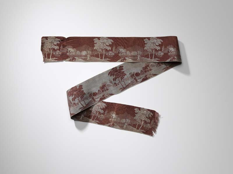 Zijden lint in donkerrood en zilvergrijs, met ingewe...