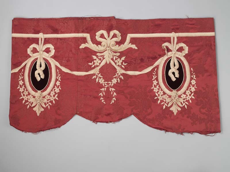 Rabat van rode damast met bloemguirlandes, met opgen...