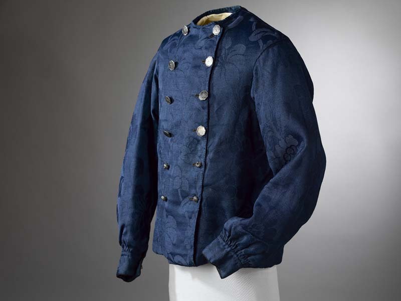 Jakje van donkerblauwe wol, de mouwen van bedrukt ka...