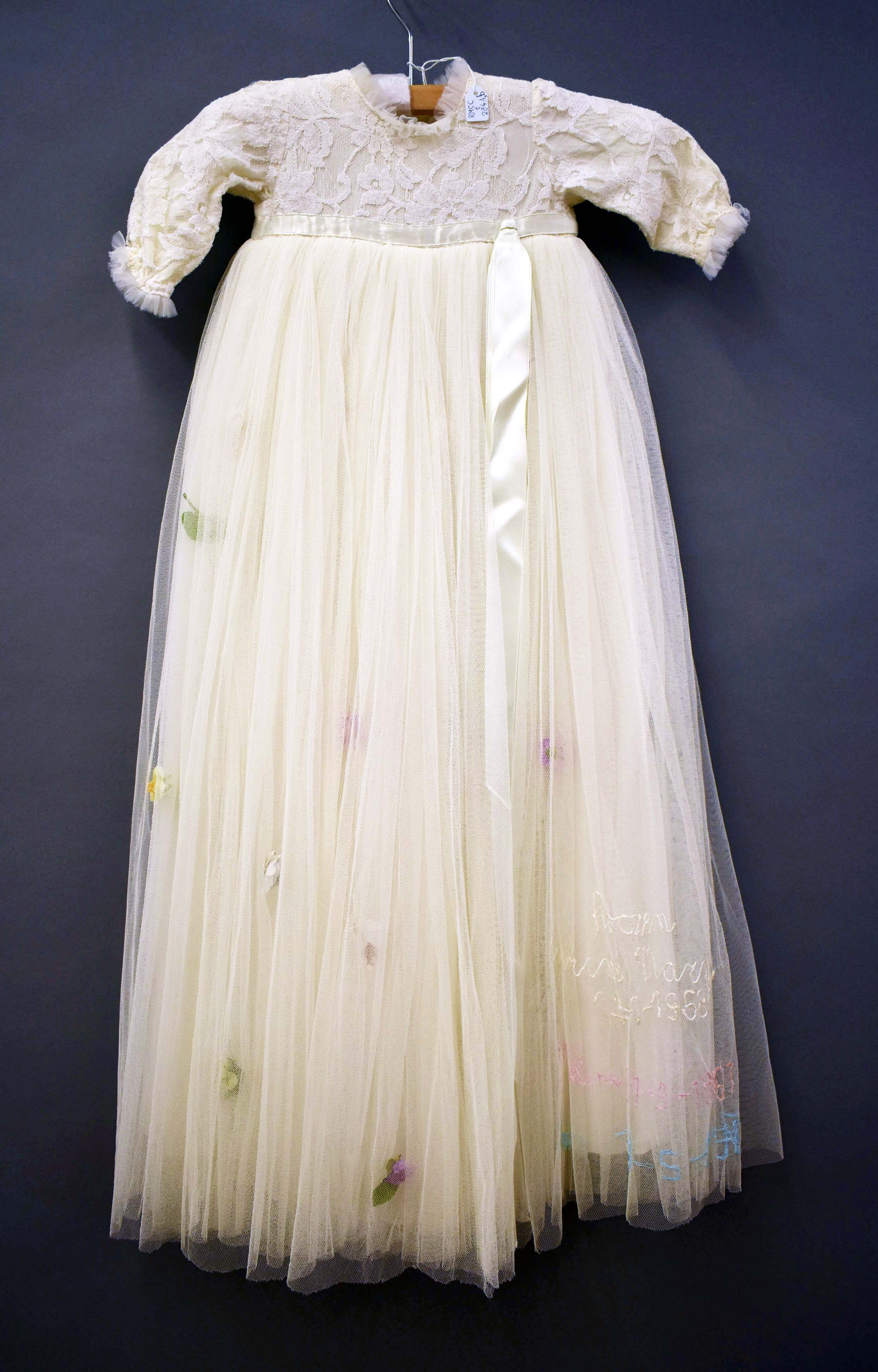 Doopjurk met tule waarop geappliceerde bloemen, gebo...