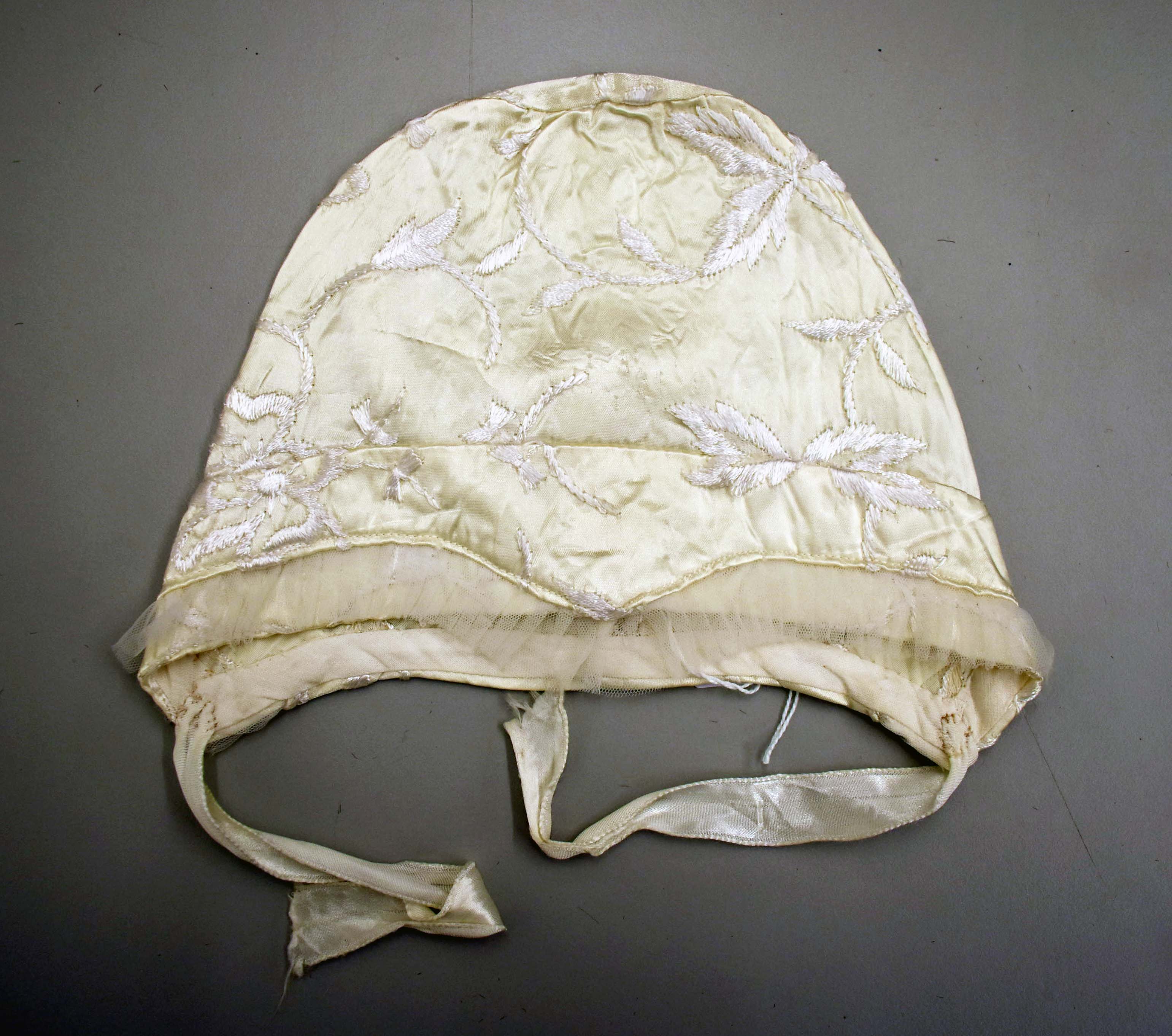 Witte doopmuts met tulerand en linten, geborduurd me...