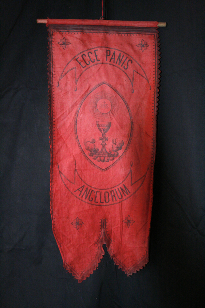 Vaandel met kelk en hostie in zwartdruk op rode stof...