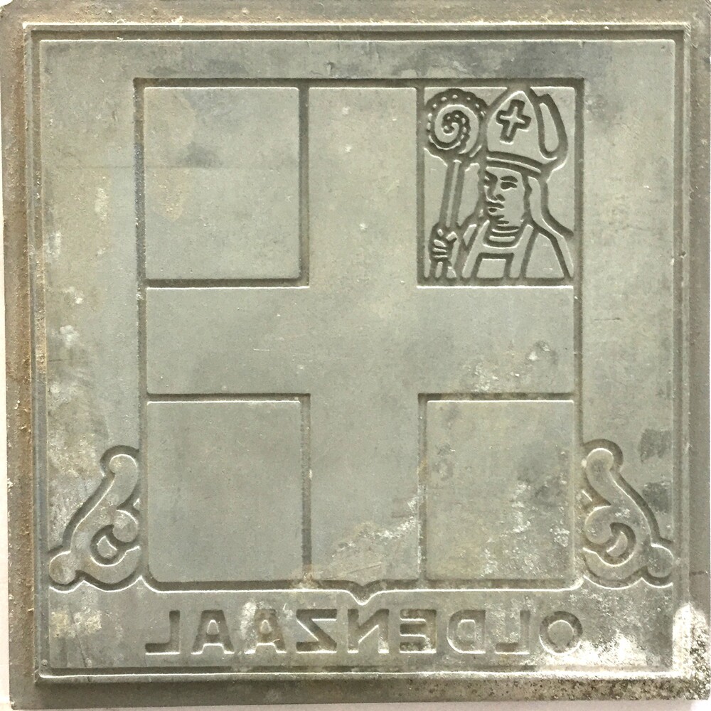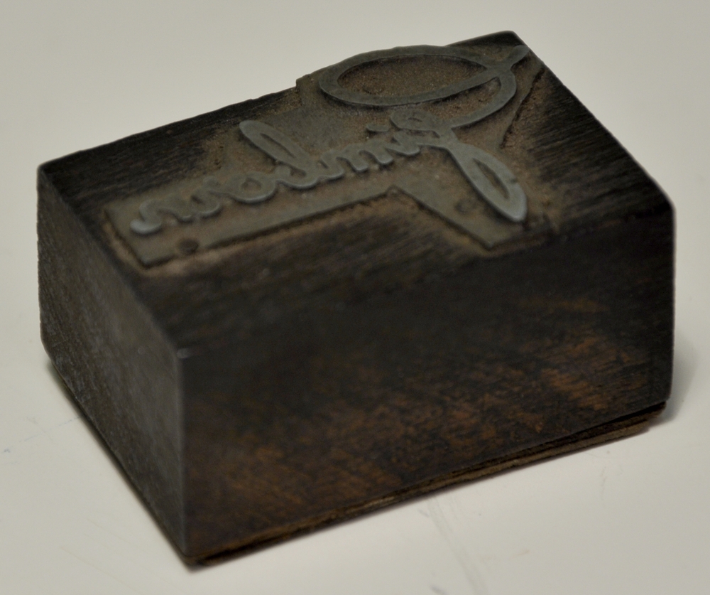 Zetblokje van hout met loden logo van de firma van G...