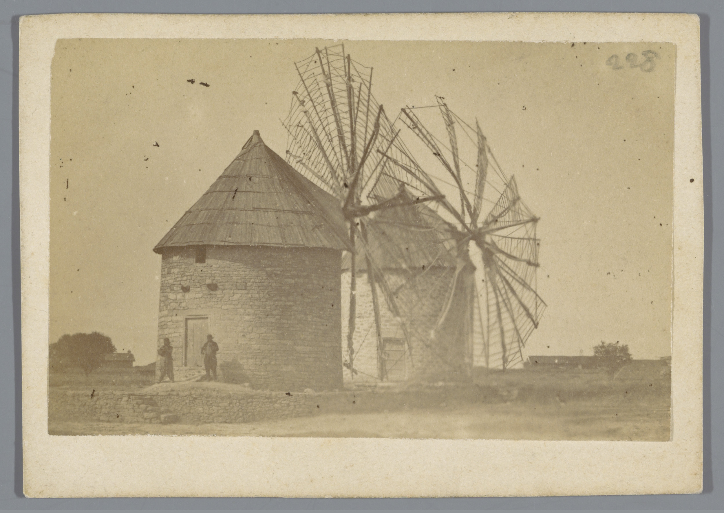 Landschap met stenen windmolens