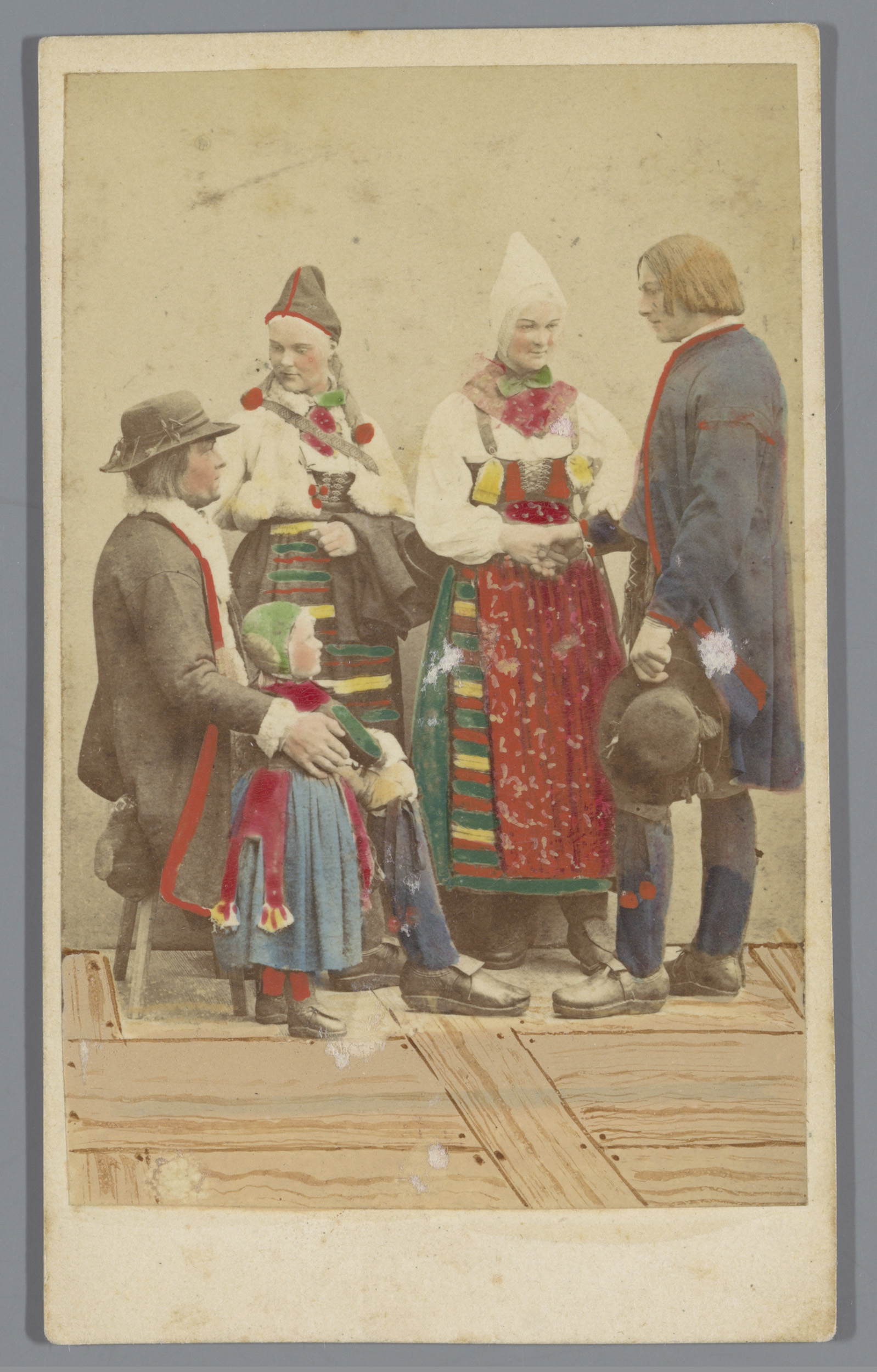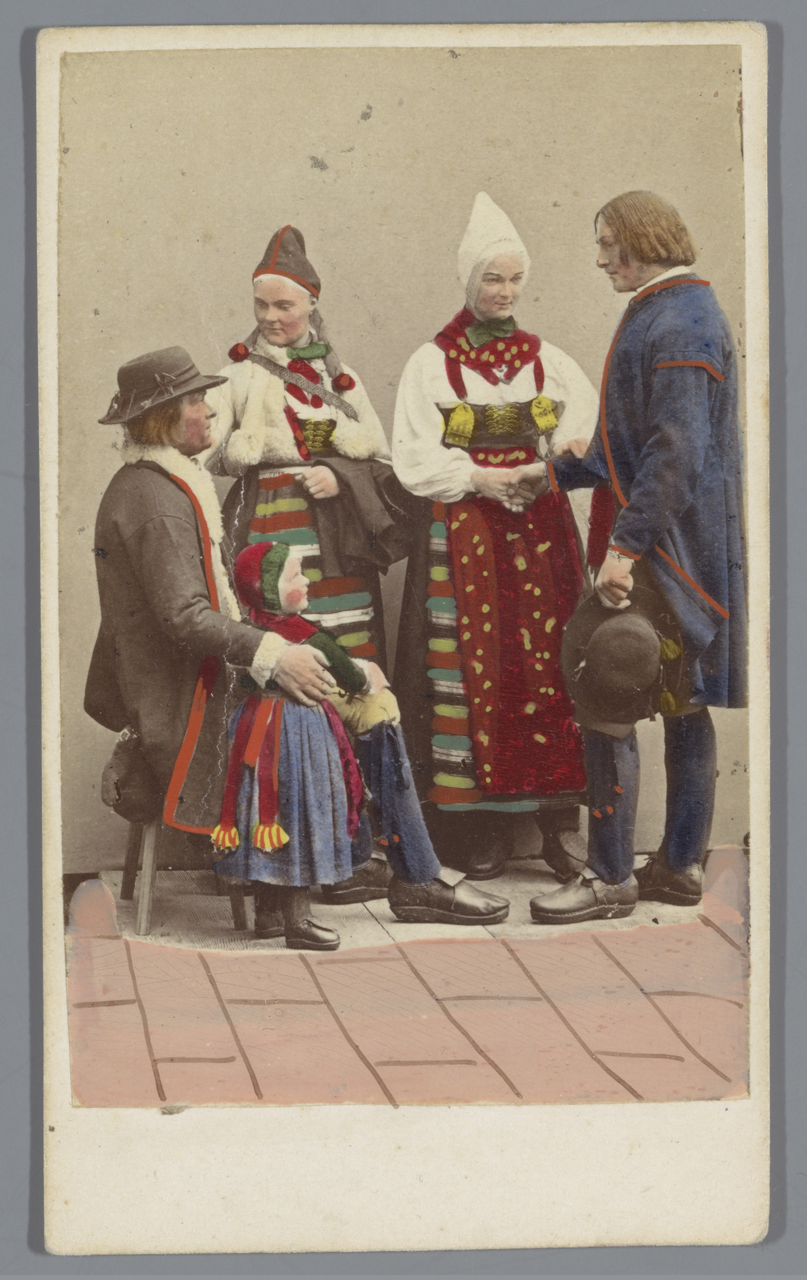 Groepsportret van vijf mensen in klederdracht uit Rä...