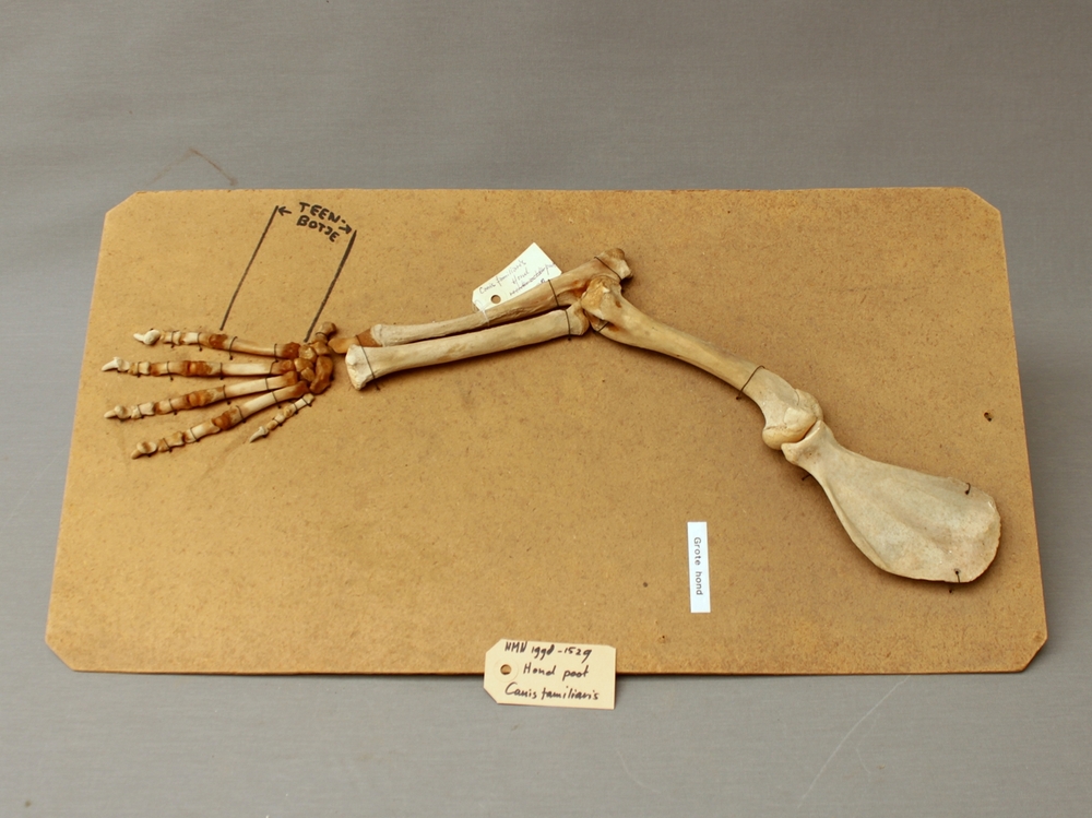 Hond; skelet voorpoot grote hond; op strokarton