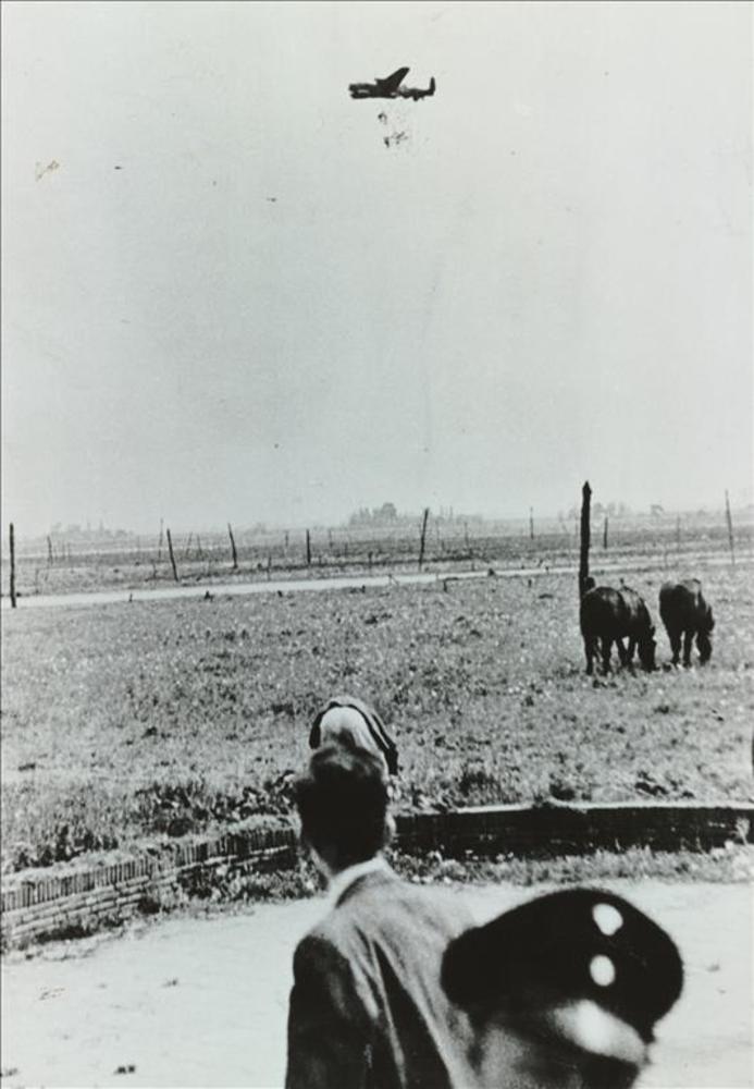 Manna; Avro Lancaster werpt voedsel af boven weiland