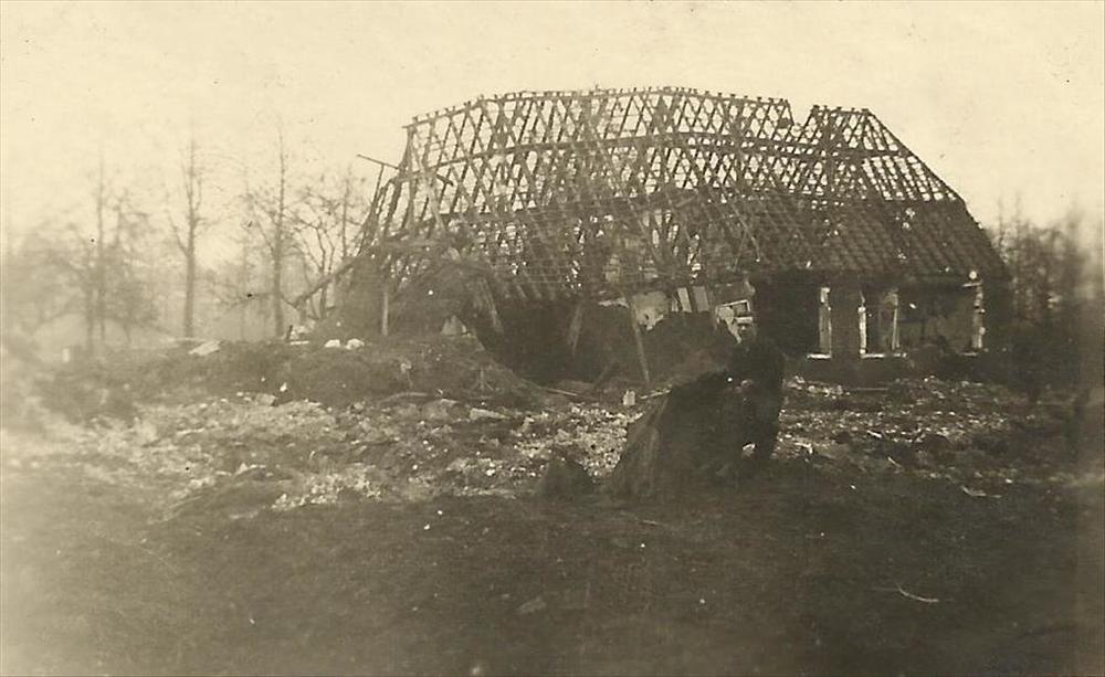 Canadese militair voor ruiïne van boerderij
