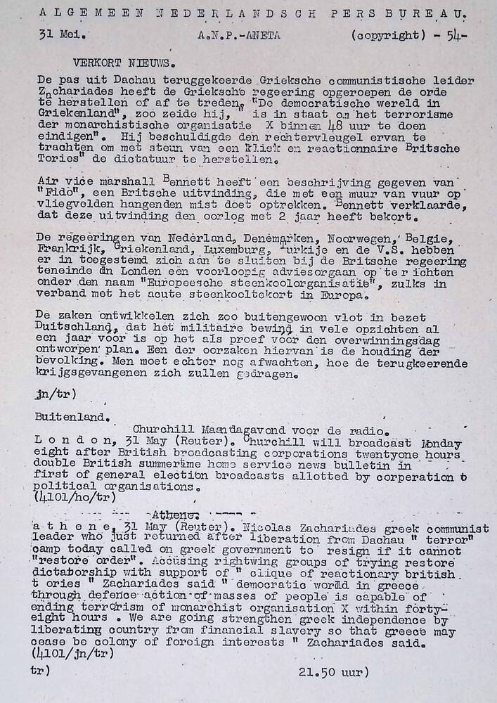 Algemeen Nederlandsch Persbureau, mededelingen, 31 m...