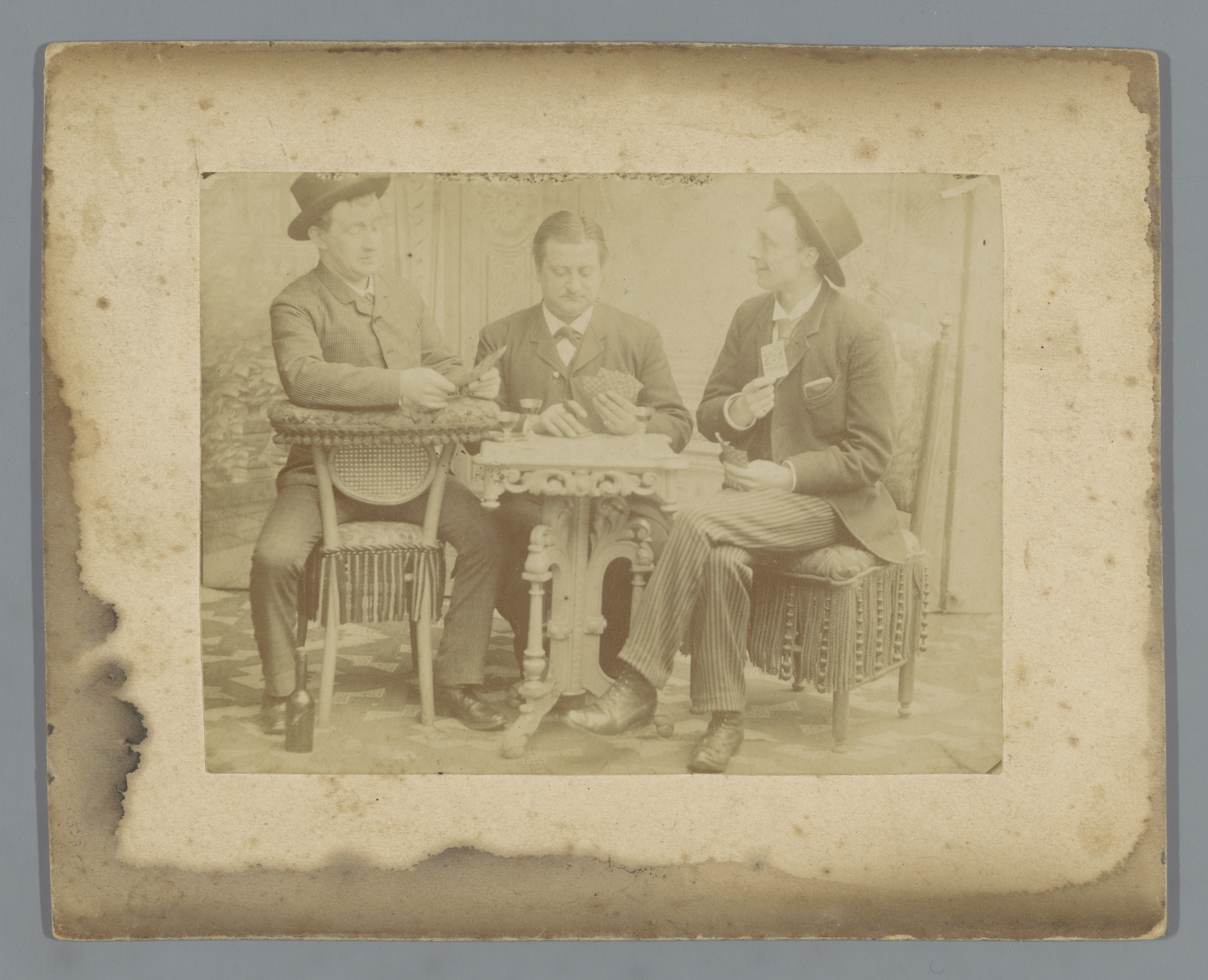 Drie kaartspelende mannen rond een tafel in een inte...
