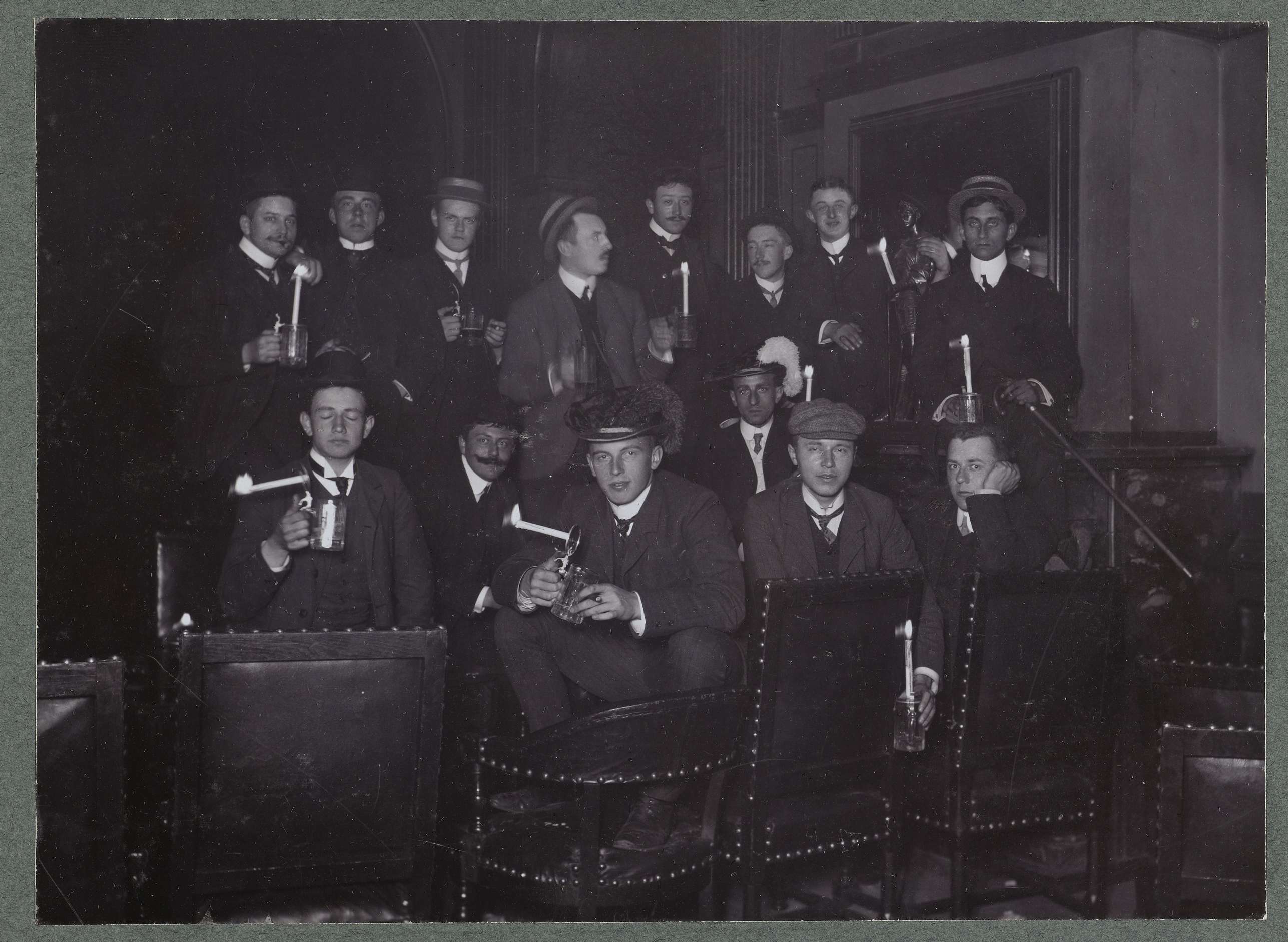 Groepsportret van studenten met bierpullen en kaarsen