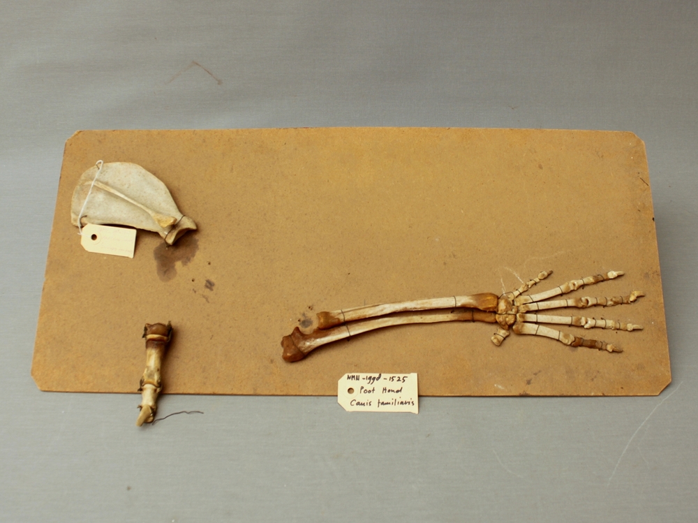 Hond; skelet achterpoot; op strokarton