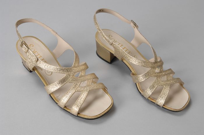 Paar damesschoenen van goudkleurig kunstleer, open m...
