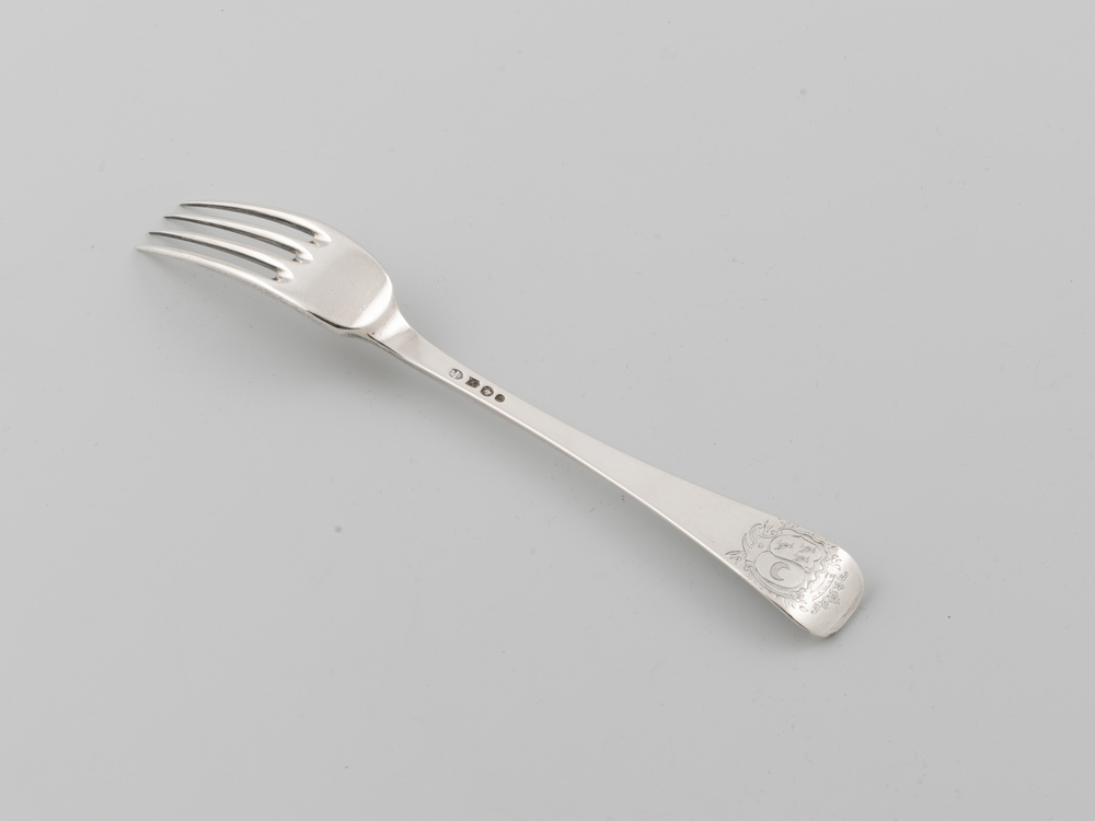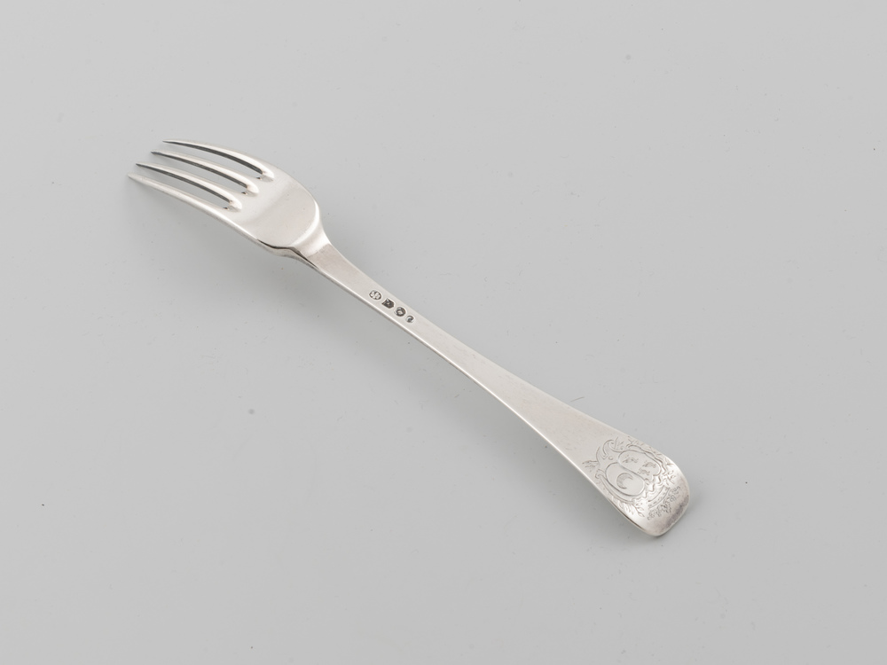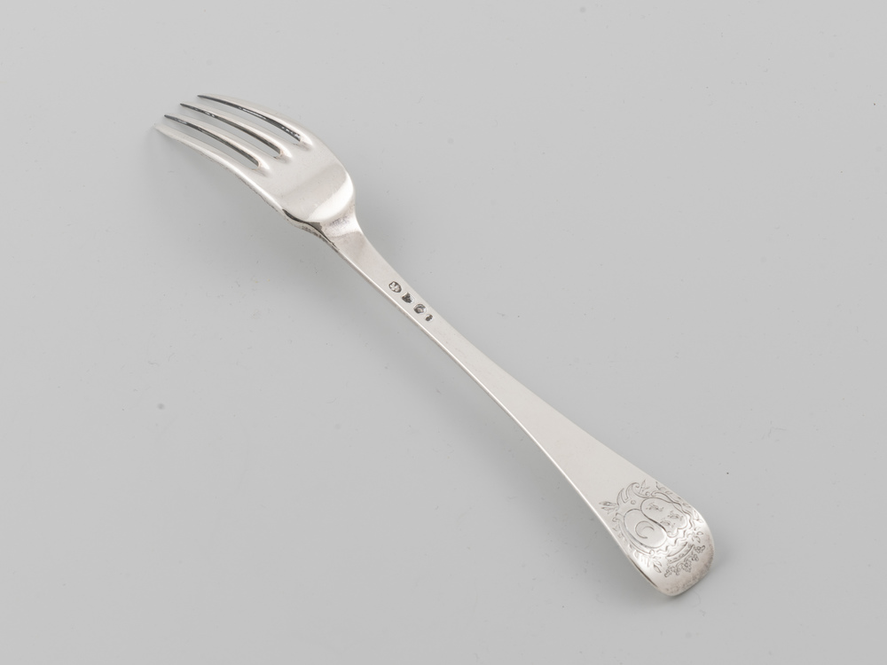 Zilveren vork met alliantiewapen Van der Borch-Sloet
