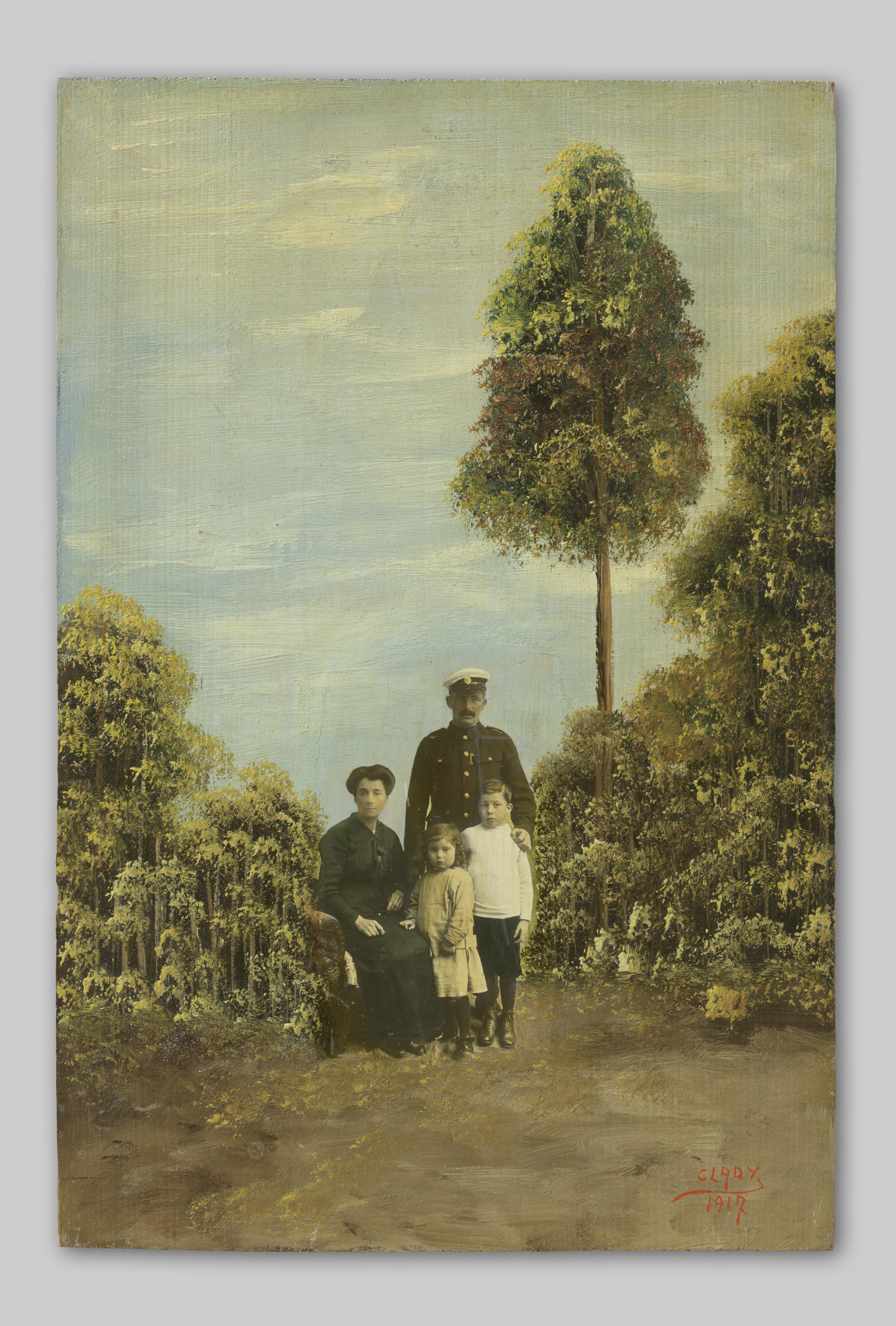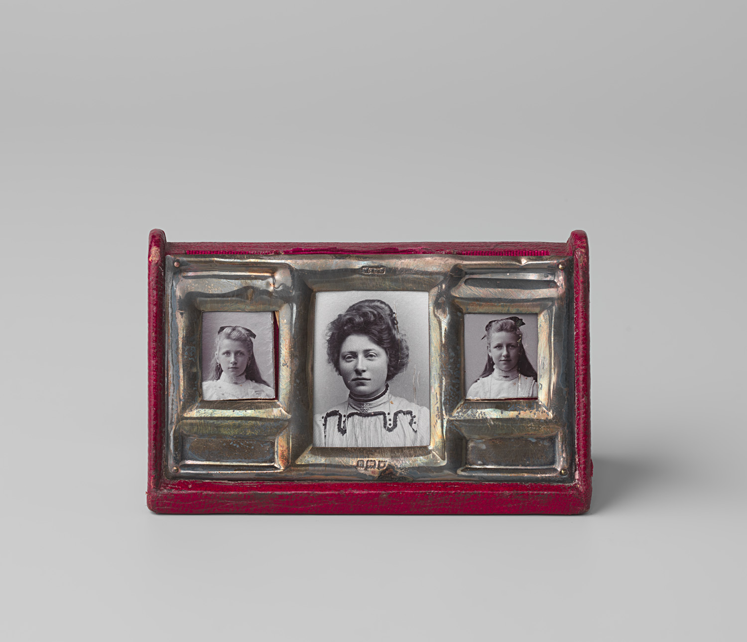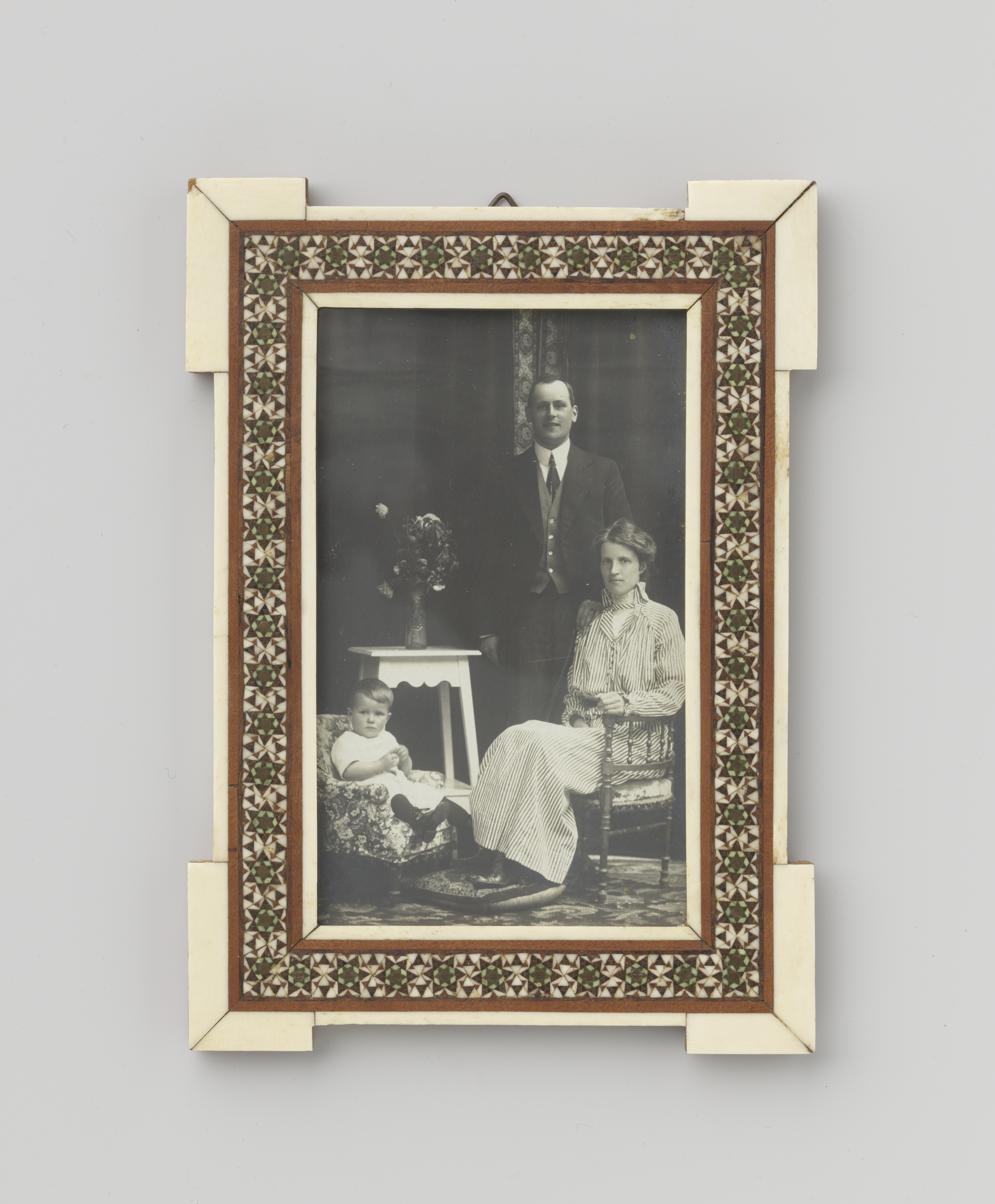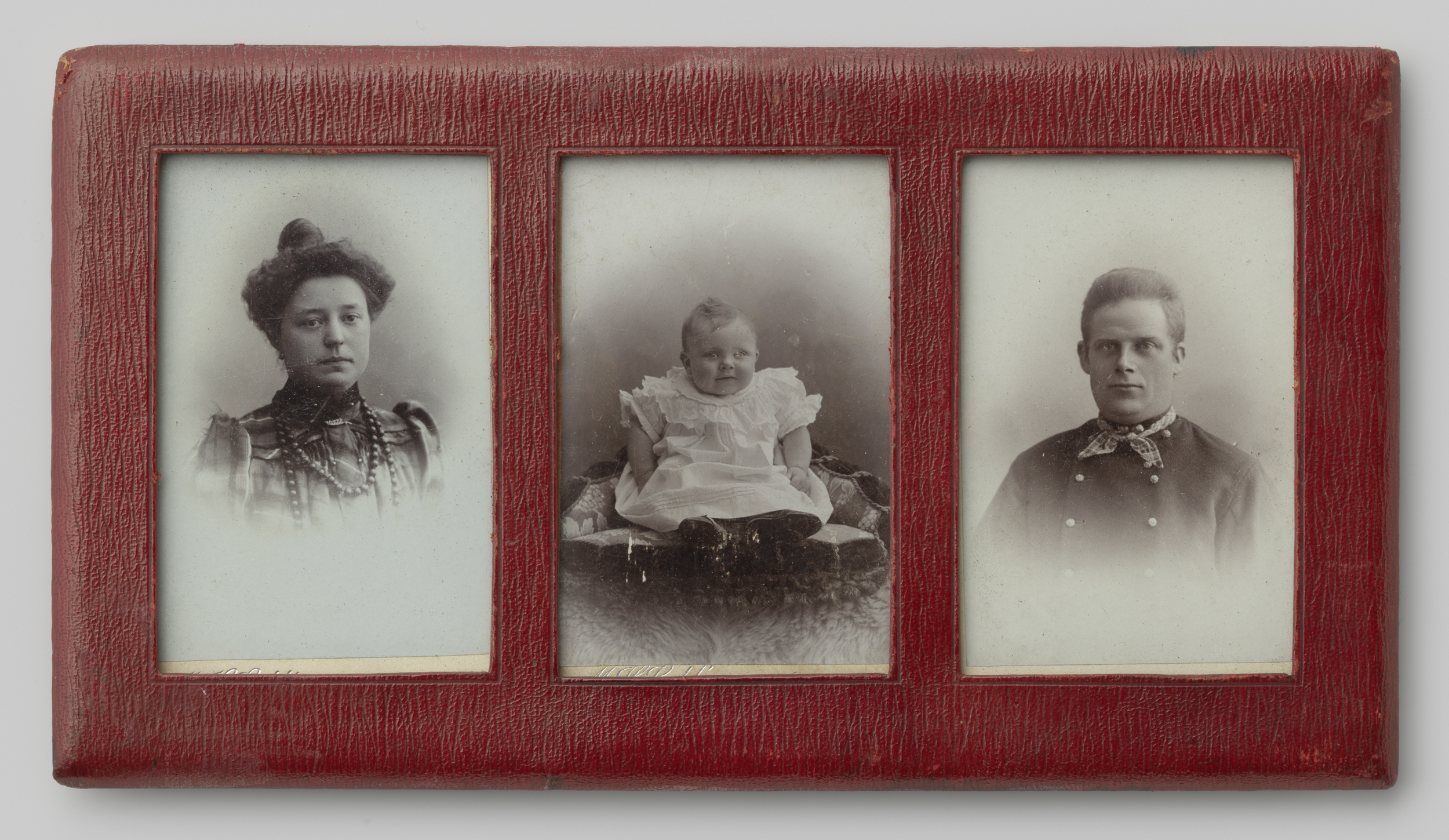 Drie portretten van een onbekend paar met kind
