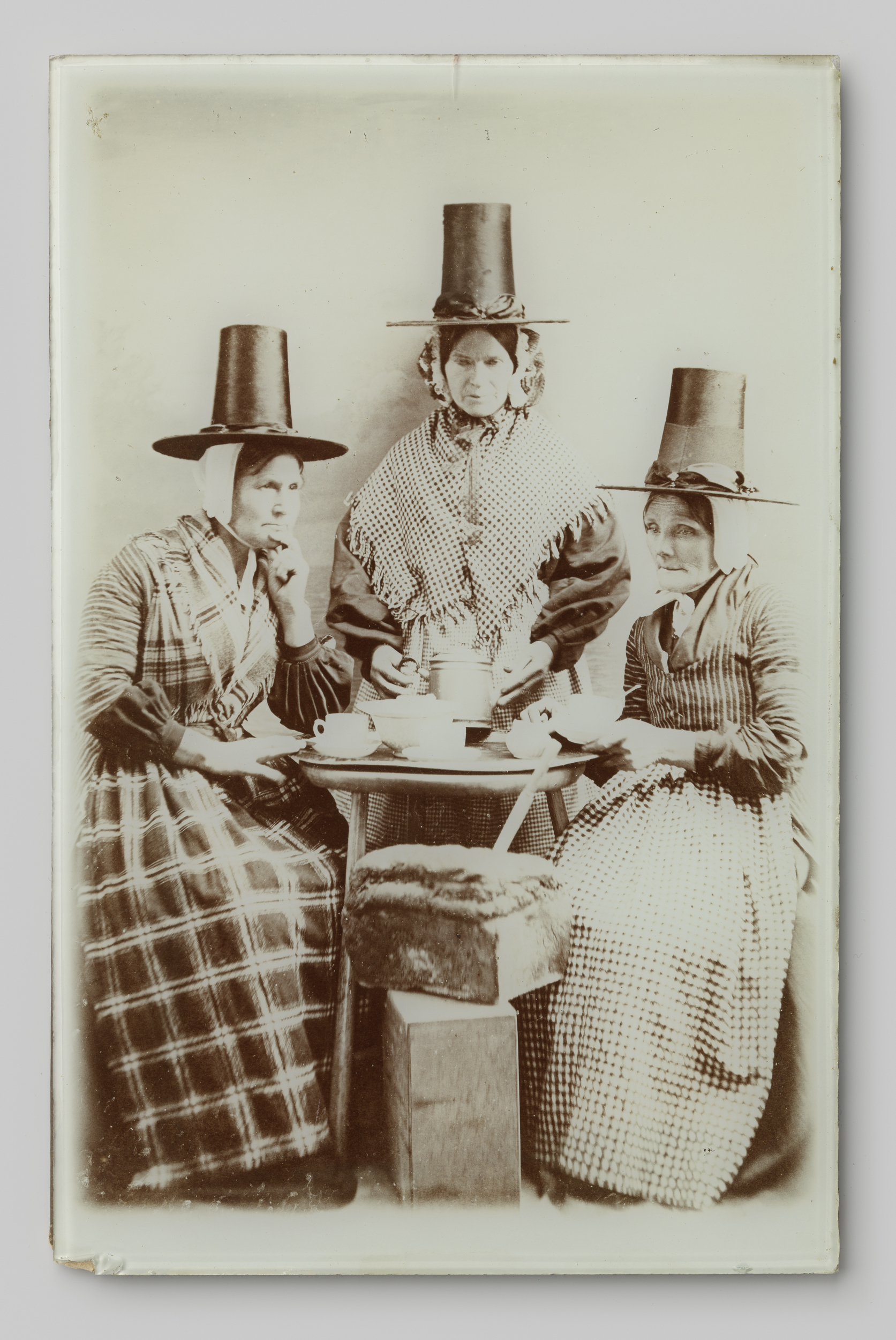 Groepsportret van drie onbekende vrouwen aan een the...