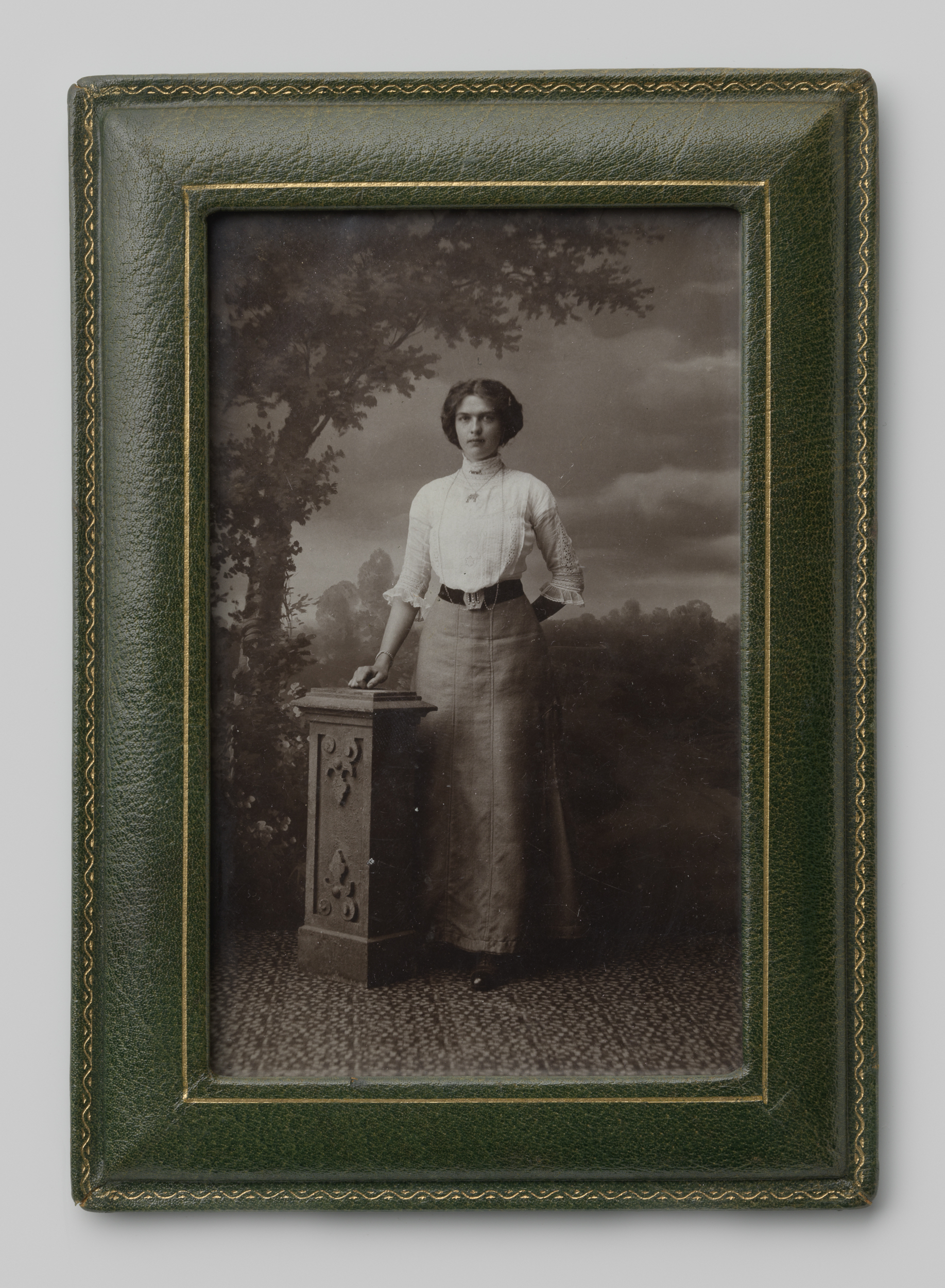 Portret van een onbekende staande vrouw bij een sokkel