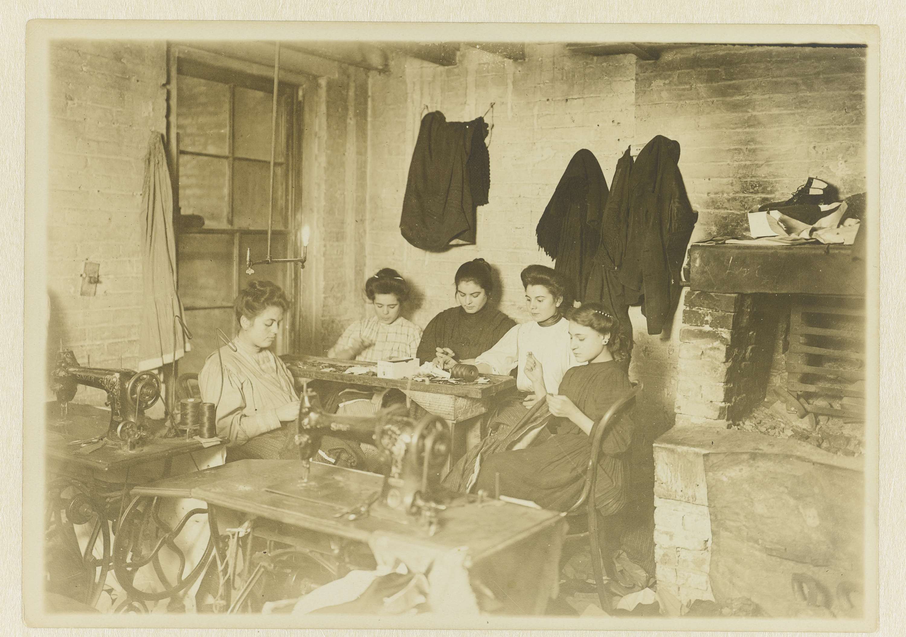 Vijf jonge naaisters in een atelier in New York