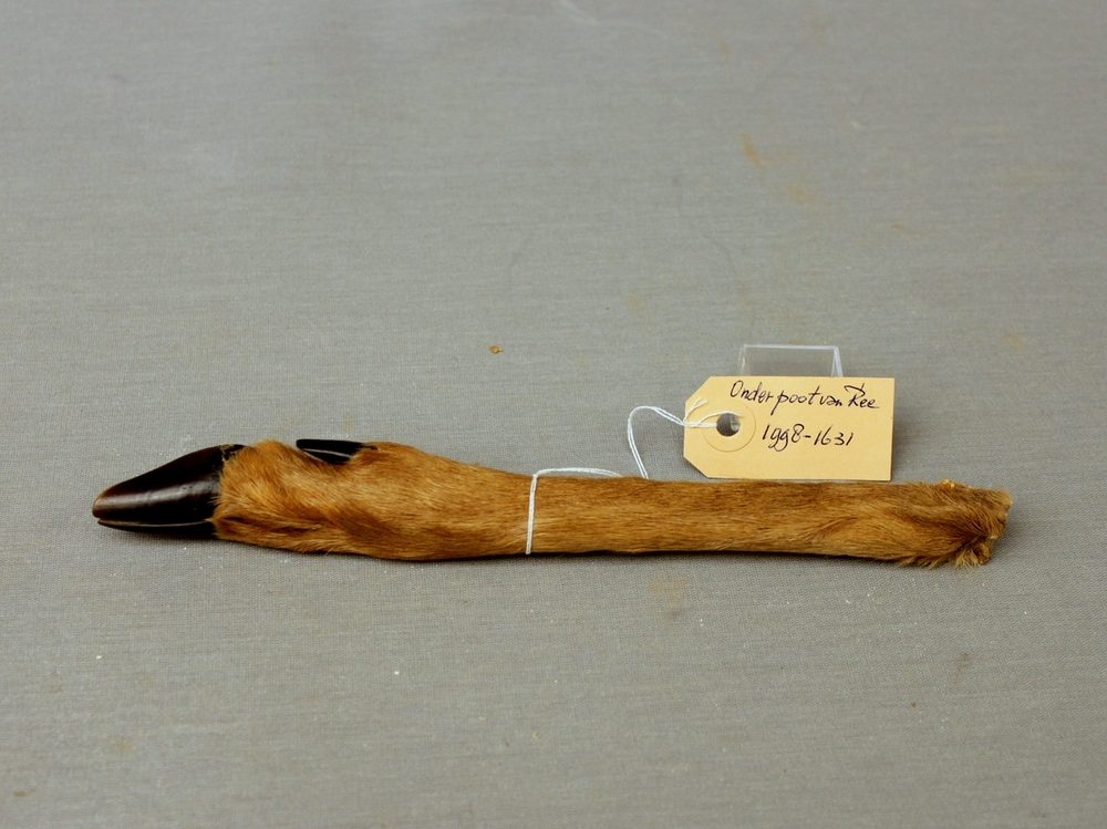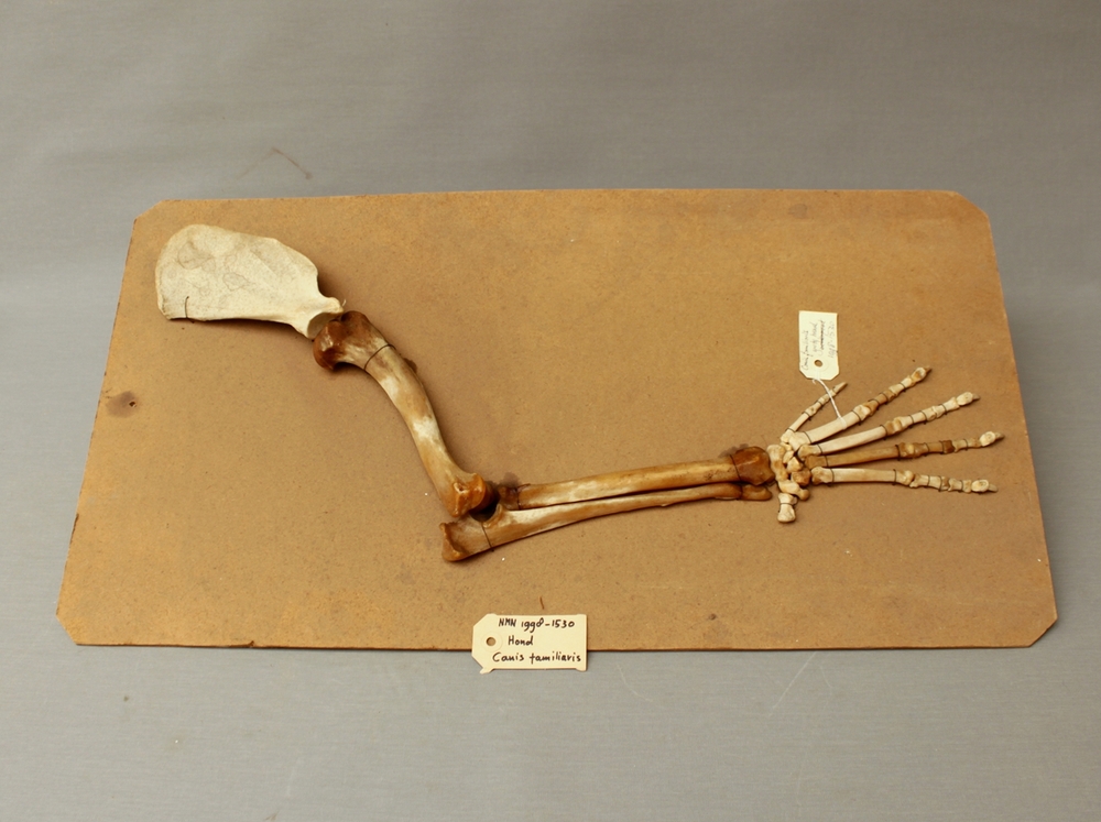 Hond; skelet voorpoot grote hond; op strokarton