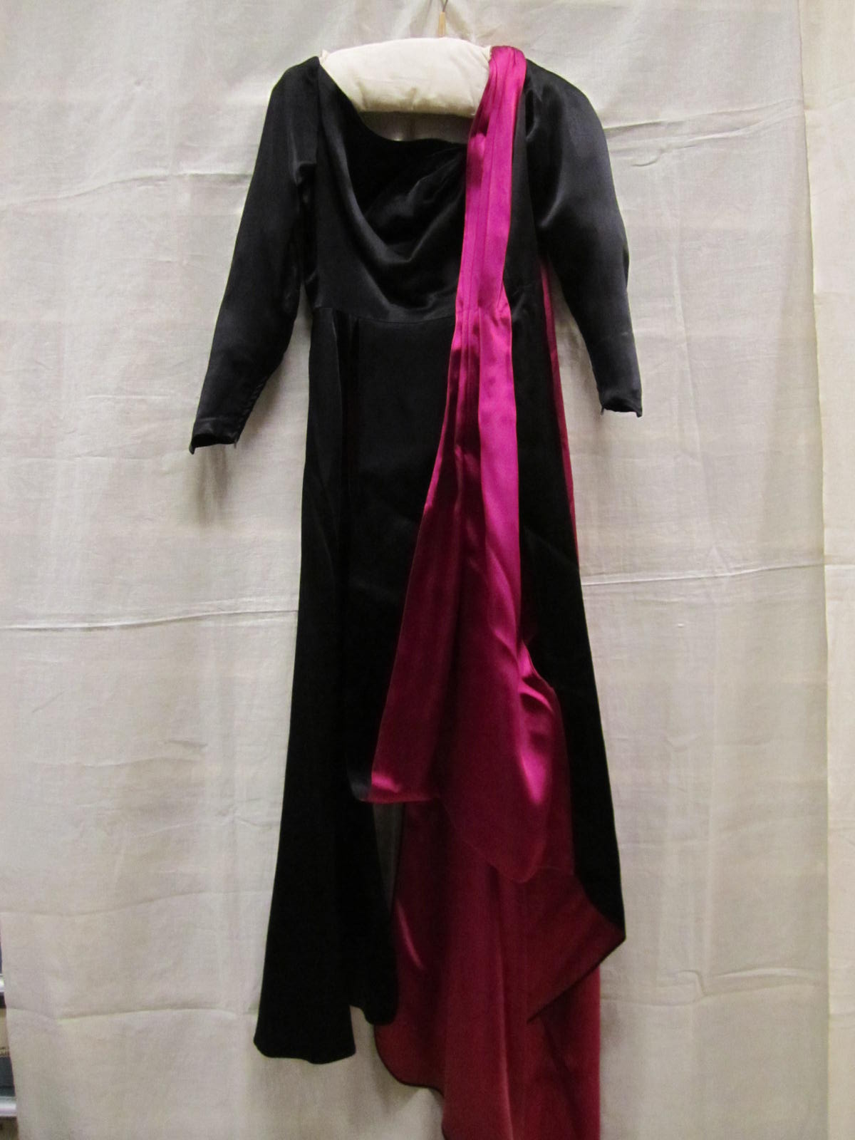 Avondjurk van zwarte en cyclaamkleurige zijden satij...