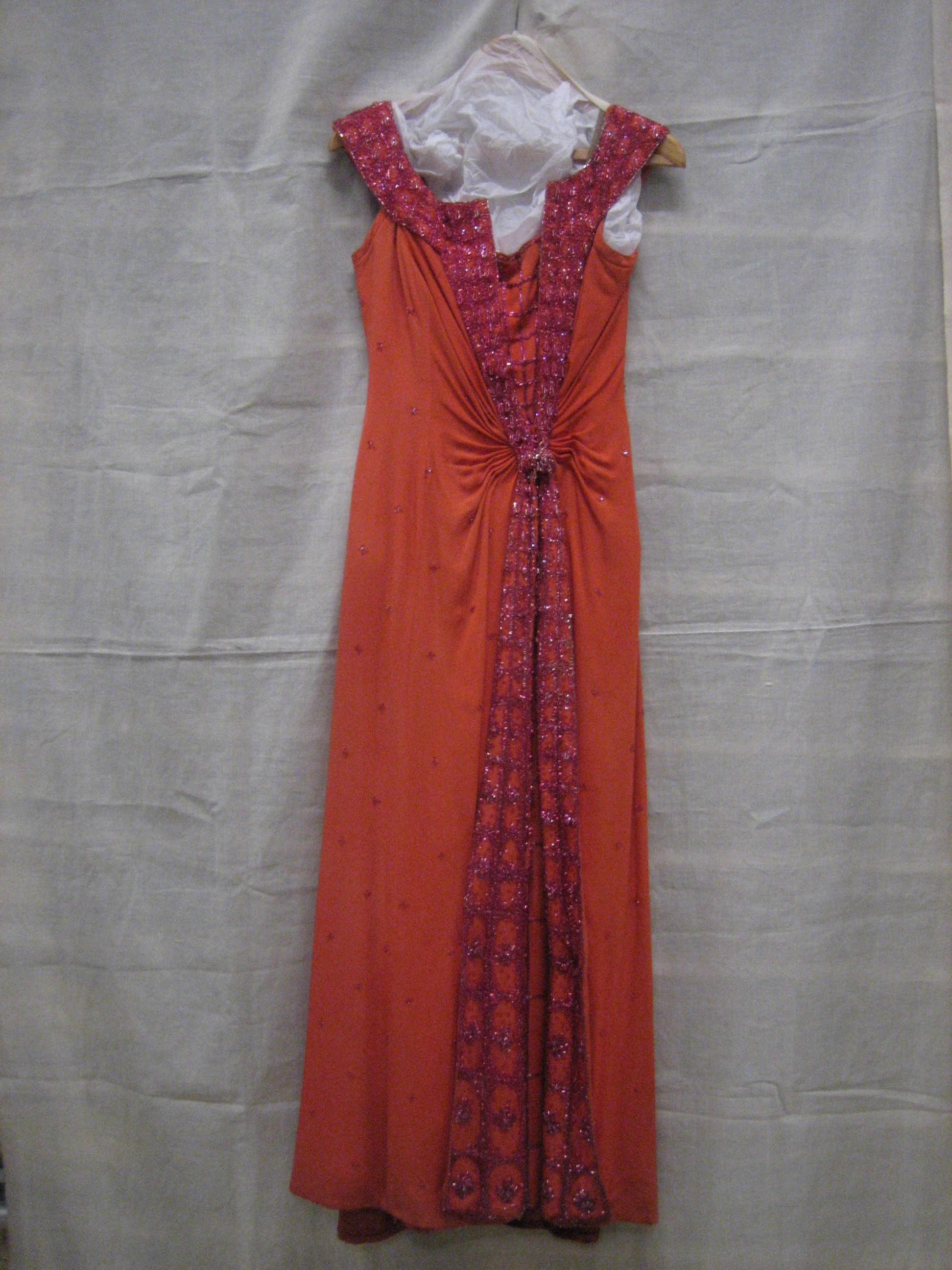 Avondjurk van oranje peau de soie, geborduurd met ro...