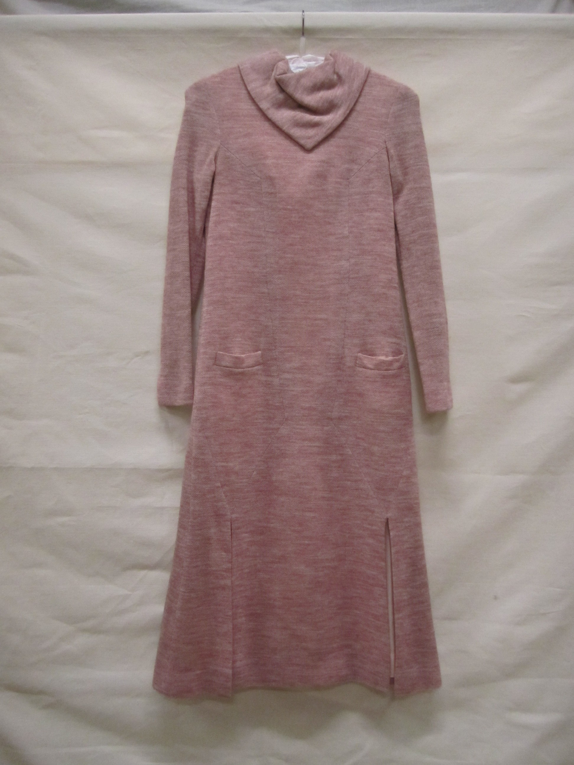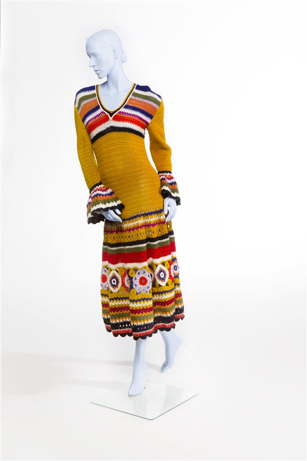 Jurk, maximodel, van okerkleurige, gehaakte wol met ...