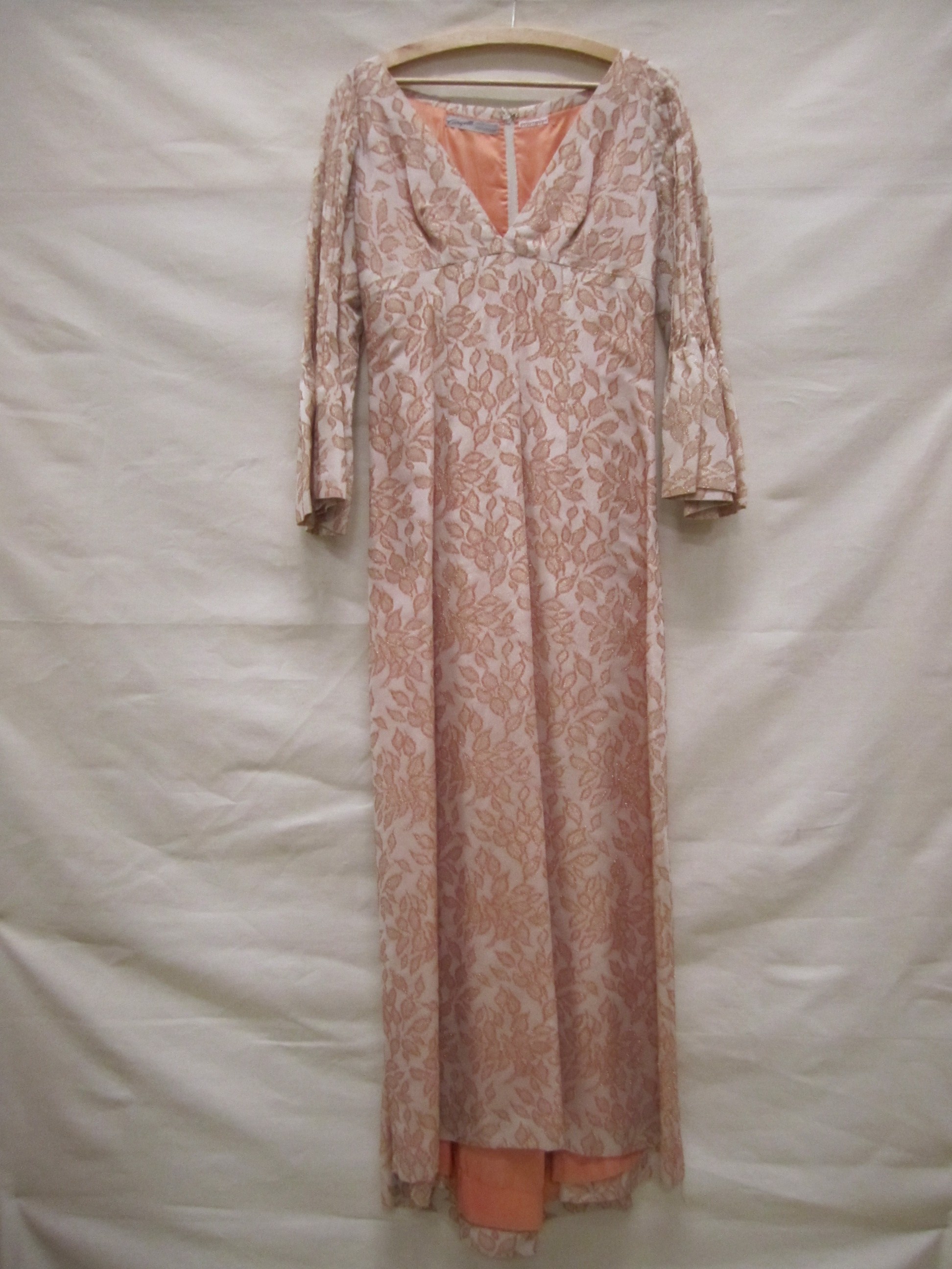 Avondjurk van wit-bruine kunstzijde met een blad pat...