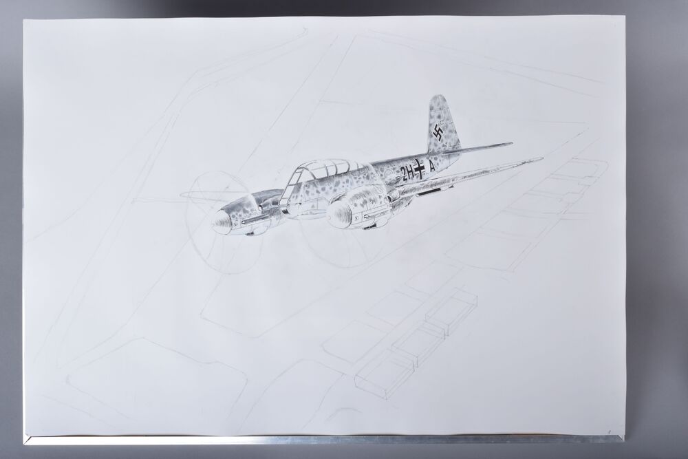 Een Luftwaffe Obergefreiter zit achter zijn tekentafel.