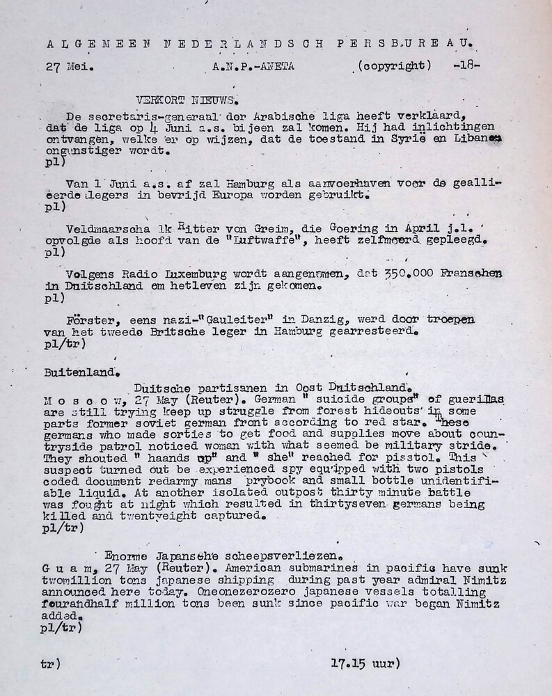 Algemeen Nederlandsch Persbureau, mededelingen, 27 m...