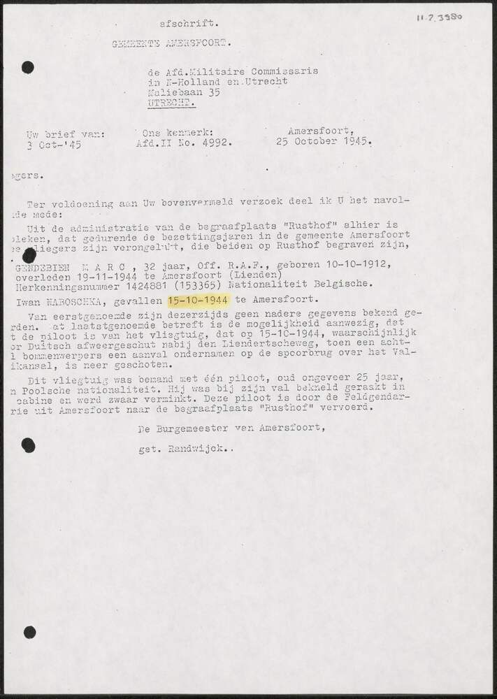 Brief van de Burgemeester van Amersfoort, 25 oktober...