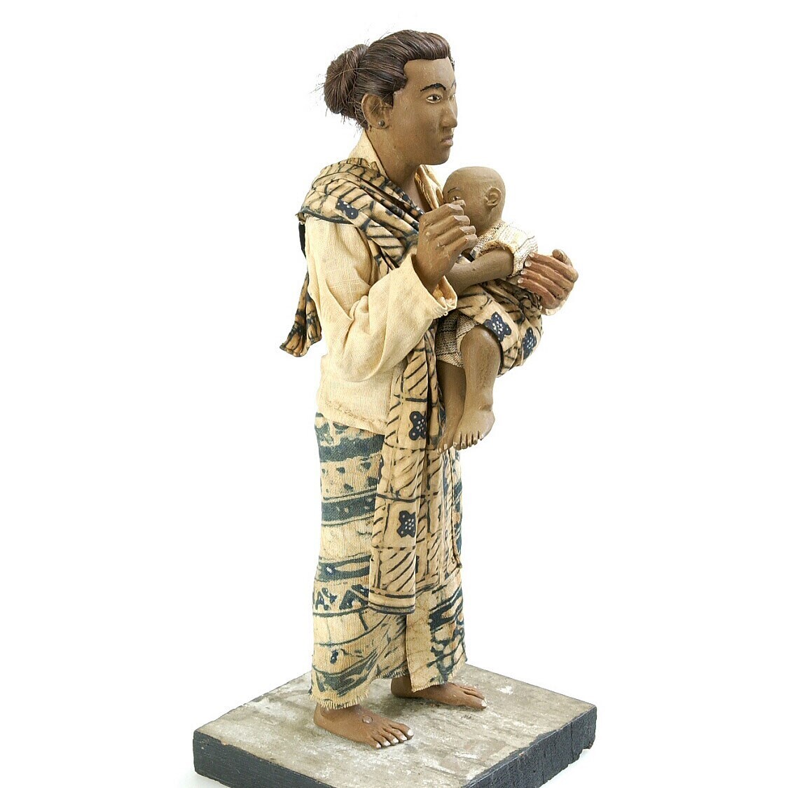Houten beeld van Javaanse vrouw met kind in draagdoek