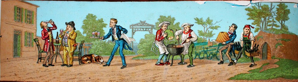 Gravure, ingekleurd, voorstellende gezicht op Herder...