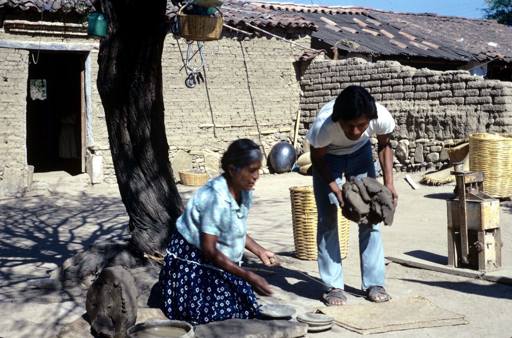 zoon Jorge brengt klei aan pottenbakster Juana Domín...