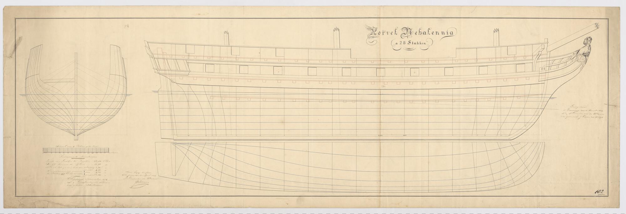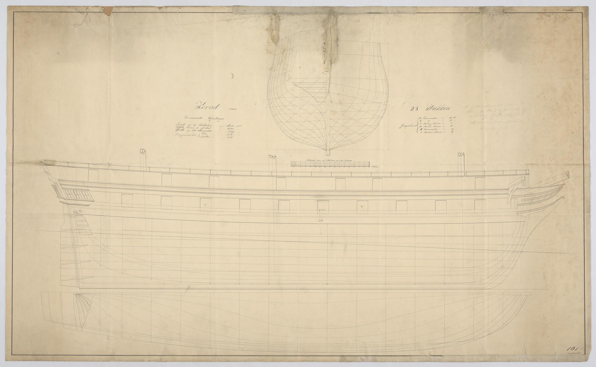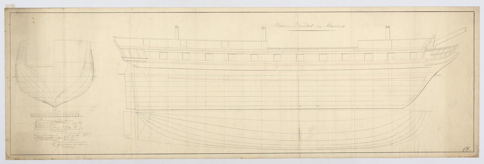Lijnenplan van een korvet van 24 stukken